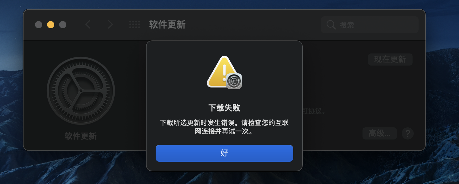 更新macos 11.4 一直显示“下载失败,下载所选更新时发生错误。”重启电脑和更换网络都尝试过,还是不行。