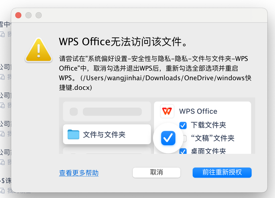 第二个:先尝试在 WPS 中访问【文稿】和【桌面】各一次,应该会有提示让你准许访问。如果没有,也有方法,可以恢复再说,最好还是使用 macOS 的功能。