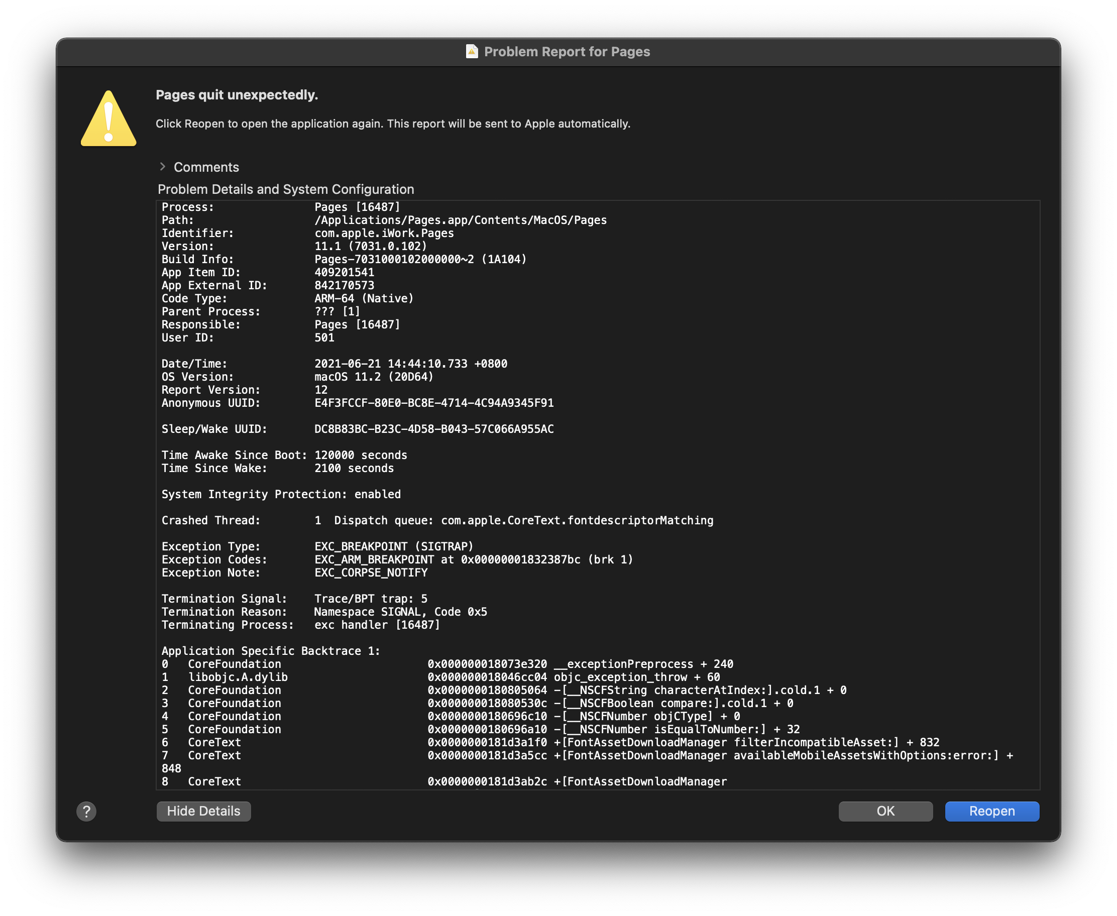 mac pro,版本是11.1,突然发生了pages闪退的情况,不仅打不开以前的文稿连新建也新建不了。打开pages就闪退,弹出意外退出的黄色三角。重新启动,卸载重装也不好使。