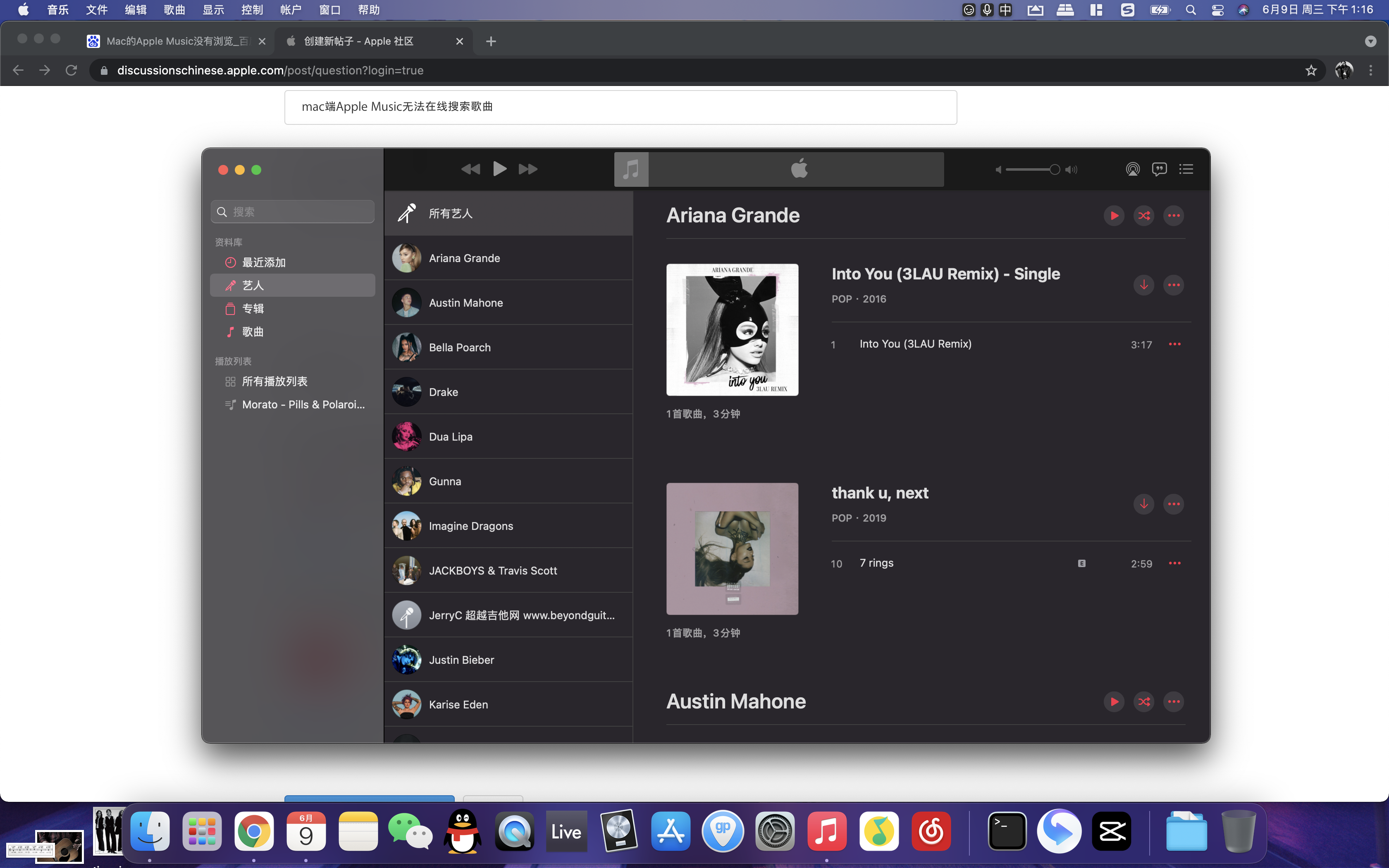 我的Mac上的音乐一直找不到搜索歌曲的地方,只能搜索本地文件和同步手机上的 歌曲 ,昨天更新了最新的系统也不行 ,后来才发现别人的界面和我的不同。我的页面左边没有浏览,广播之类的选项,感觉它不是一个可以搜索的听歌软件,更像一个设备自带播放本地歌曲的播放器 。求大神帮忙解决,在此感谢。