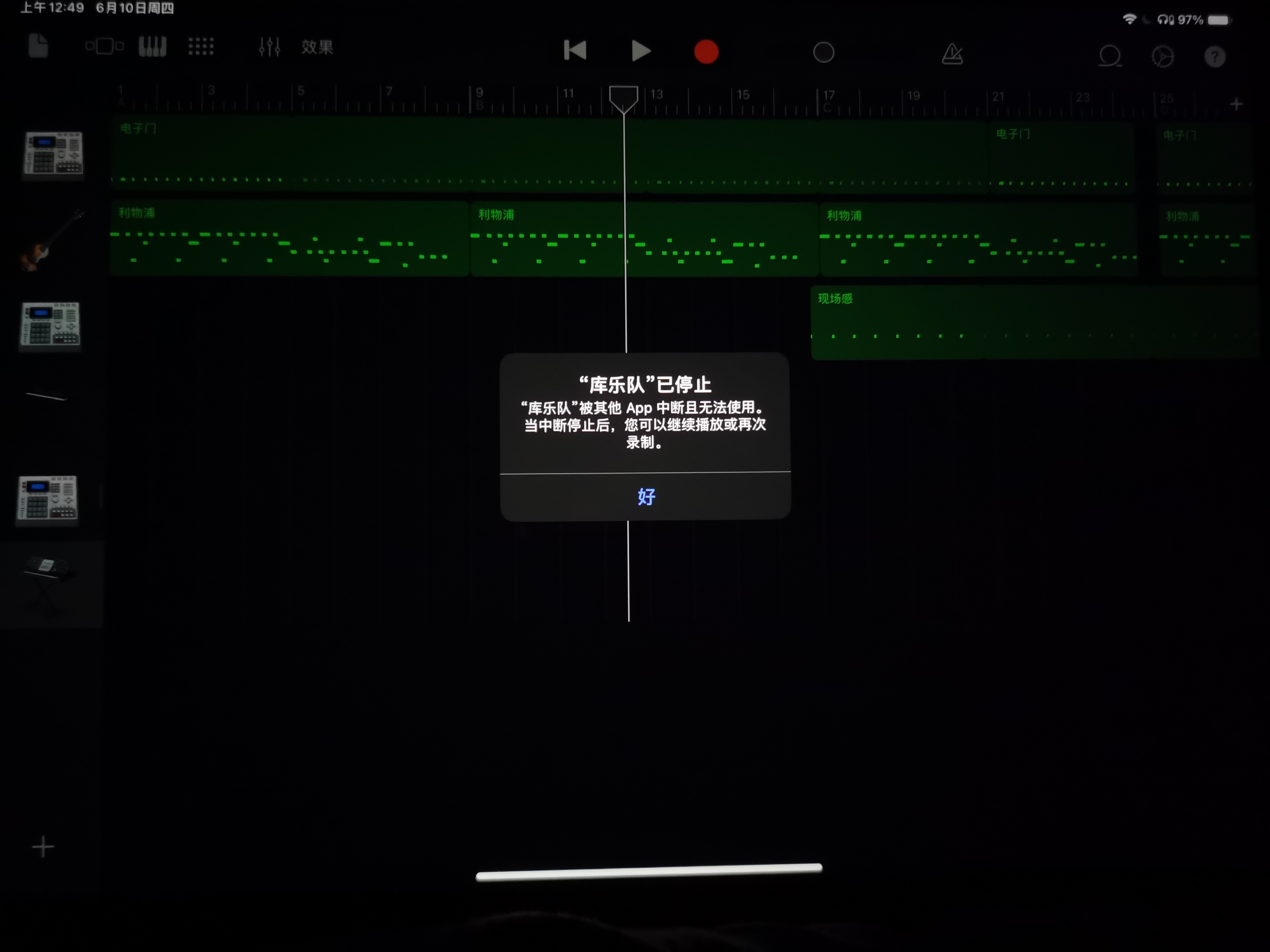 我也有这个问题,ipad air 4,ipados14.6,显示(库乐队被其他应用中断),之后,app会变得很卡顿,且弹奏没声音,卸载或者还原设置都不起作用