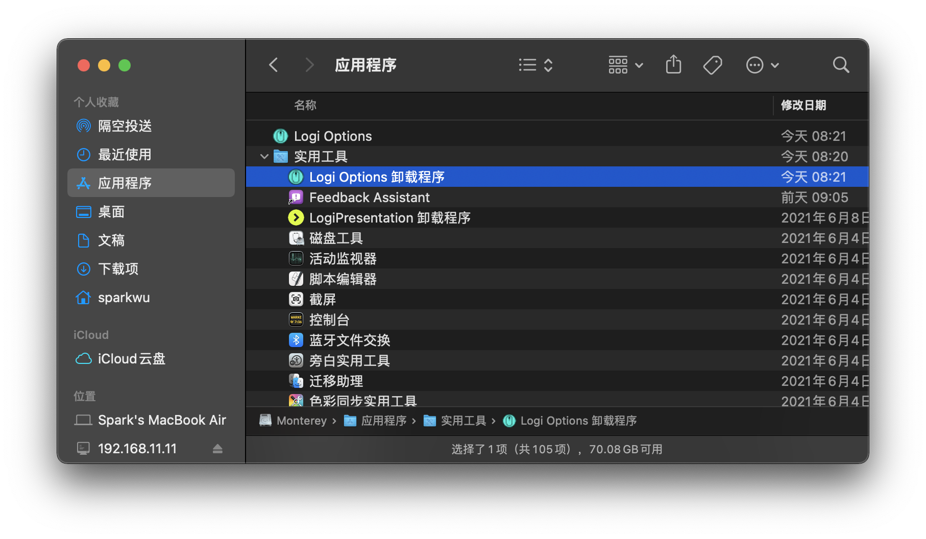 使用访达访问“应用程序”文件夹,然后在“实用工具”里面运行“Logi Options 卸载程序”