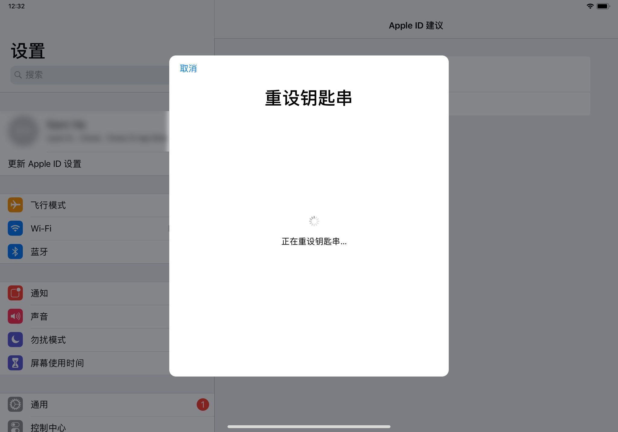 -此时所有其他手头的ios设备并无任何消息提示与批准有关的内容。点击【无法批准此ipad】后,对话框要求【重设钥匙串】并点击同意继续,此时转为【重设钥匙串】并一直在该对话框等待,如图