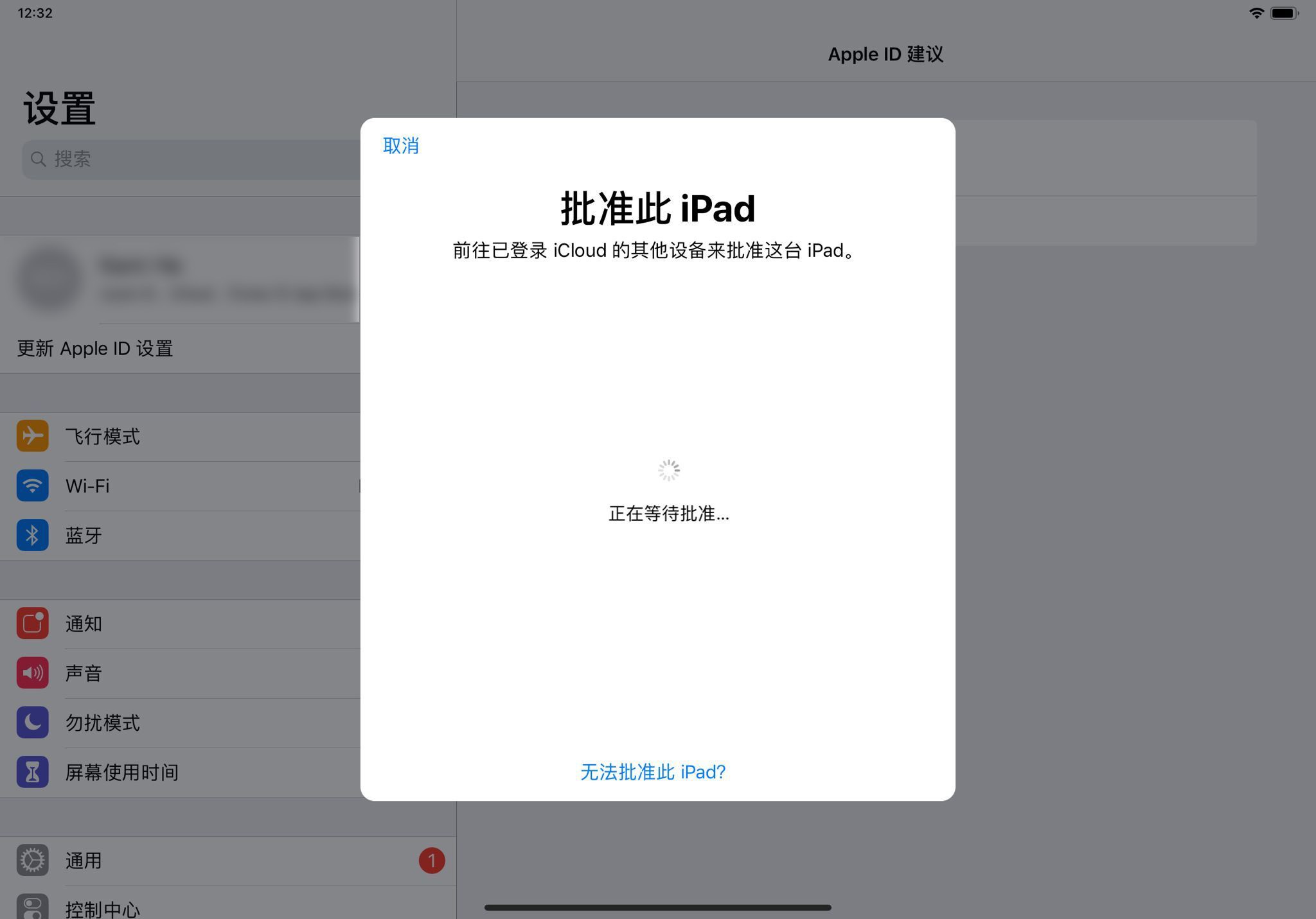 -在退出apple id并重新登录后,设备中的ipad pro(2018版)和ipad mini(5代)在【更新apple id设置】提示下输入密码后,无法正常消除红点,而是弹出【批准此ipad】的对话框,如图