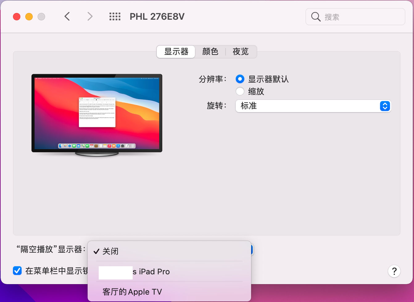 您好,显示设置中的“‘隔空播放’显示器”没有“打开”这一选项,而是选择相对应的隔空播放设备(如图)。您需要拥有支持“随航”功能的iPad、或同一局域网下的Apple TV等支持隔空播放的设备来作为隔空播放的选项。若您没有任何支持的设备,则该选项只能保持关闭。
