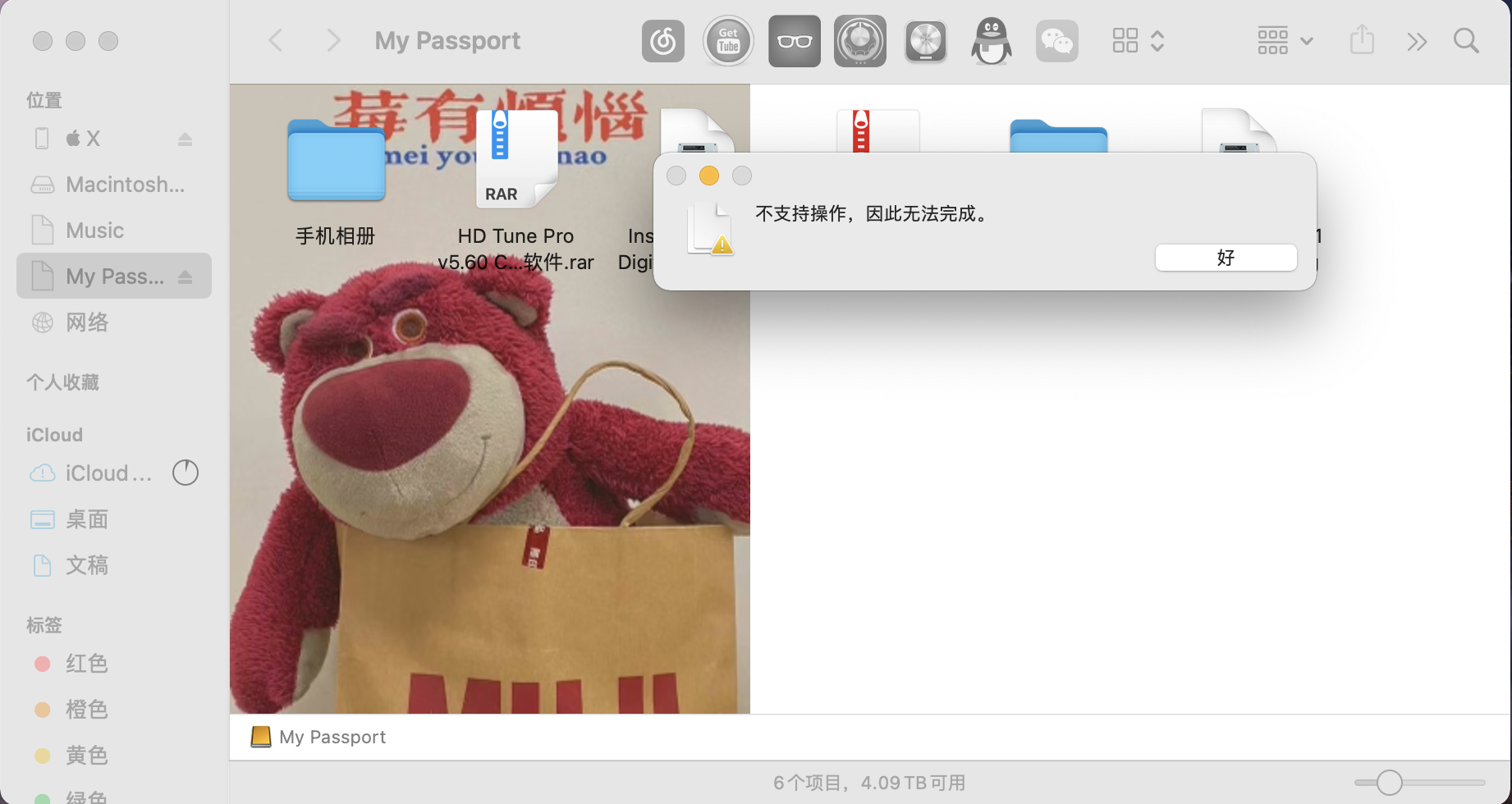 5t的移动硬盘已经用Macbook拷了进了1t的数据,继续拷贝为何“显示不支持此操作,因此无法完成”。
