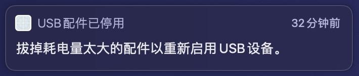 MacBook pro,一直提示『USB配件已停用』。我插了一个扩展坞,有时候给手机充电。之前用得好好的,突然有一天就开始提示了。然后我拔了手机,还会提示。拔了扩展坞,就插一个电源,仍然还会提示。我真是醉了。