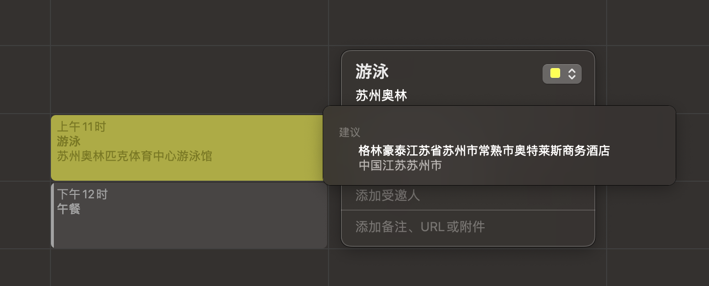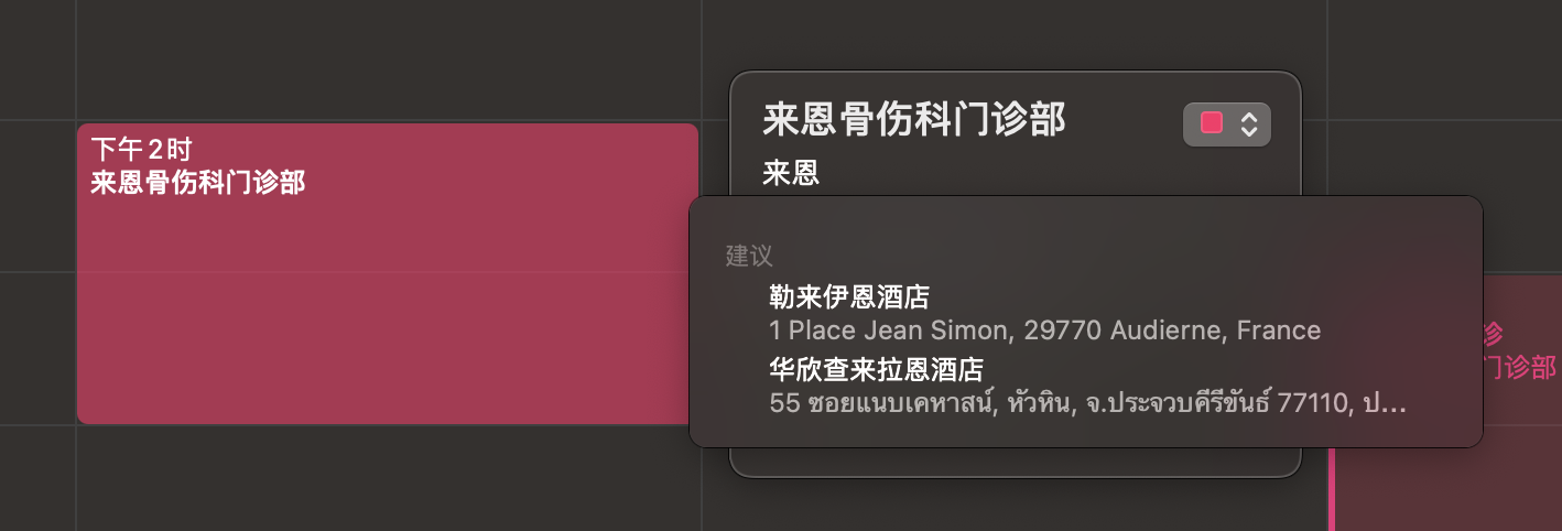 我希望通过在日历事件中添加地址,来获得行程时间建议。在iPhone上或是之前使用的Mac上,我键入地址的前几个字之后,就可以从选项中选取。但是在现在的Mac端,我看到了没什么关联的搜索结果(如图1),或是其他城市的搜索结果(如图2)。请问是否有人知道原因何在,如何解决?谢谢。