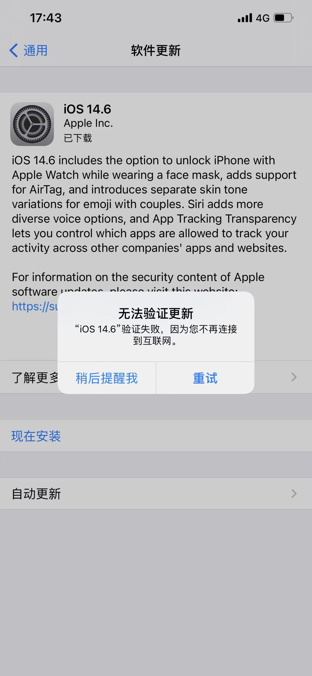 排除这些情况外,还可以在“设置”-“通用”-“ iPhone 储存空间”中找到这个更新所占用的空间储存将其删掉,然后回到“软件更新”中重新下载尝试验证安装。