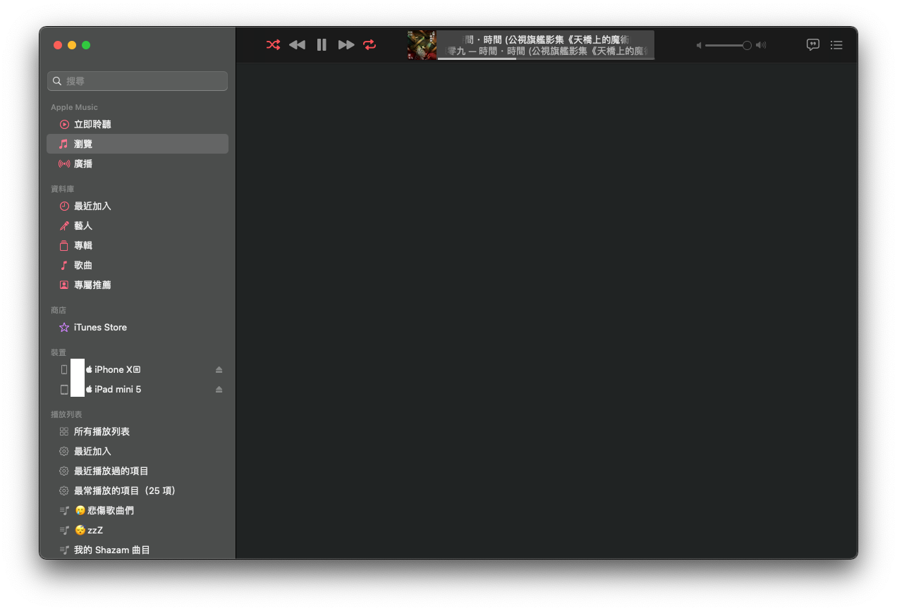 打开Apple Music之后左下角会弹出一个正在同步资料库然后马上没了,换到上面三个“现在就听”“浏览”和“广播”全部都是空白,也没有任何加载动画感觉是在加载的样子。然后资料库是可以正常加载和正常播放的。同时我手机上的Apple Music是可以正常加载上面三个在线内容的。