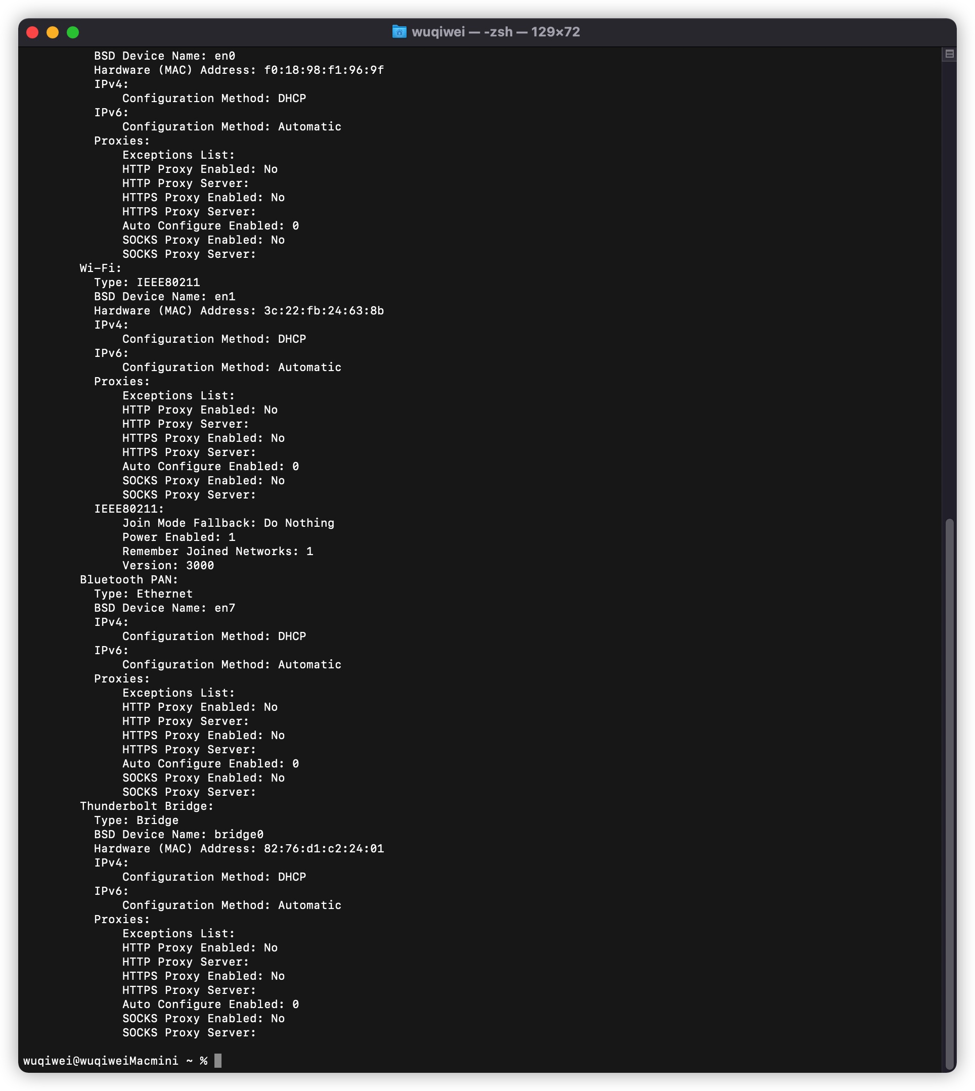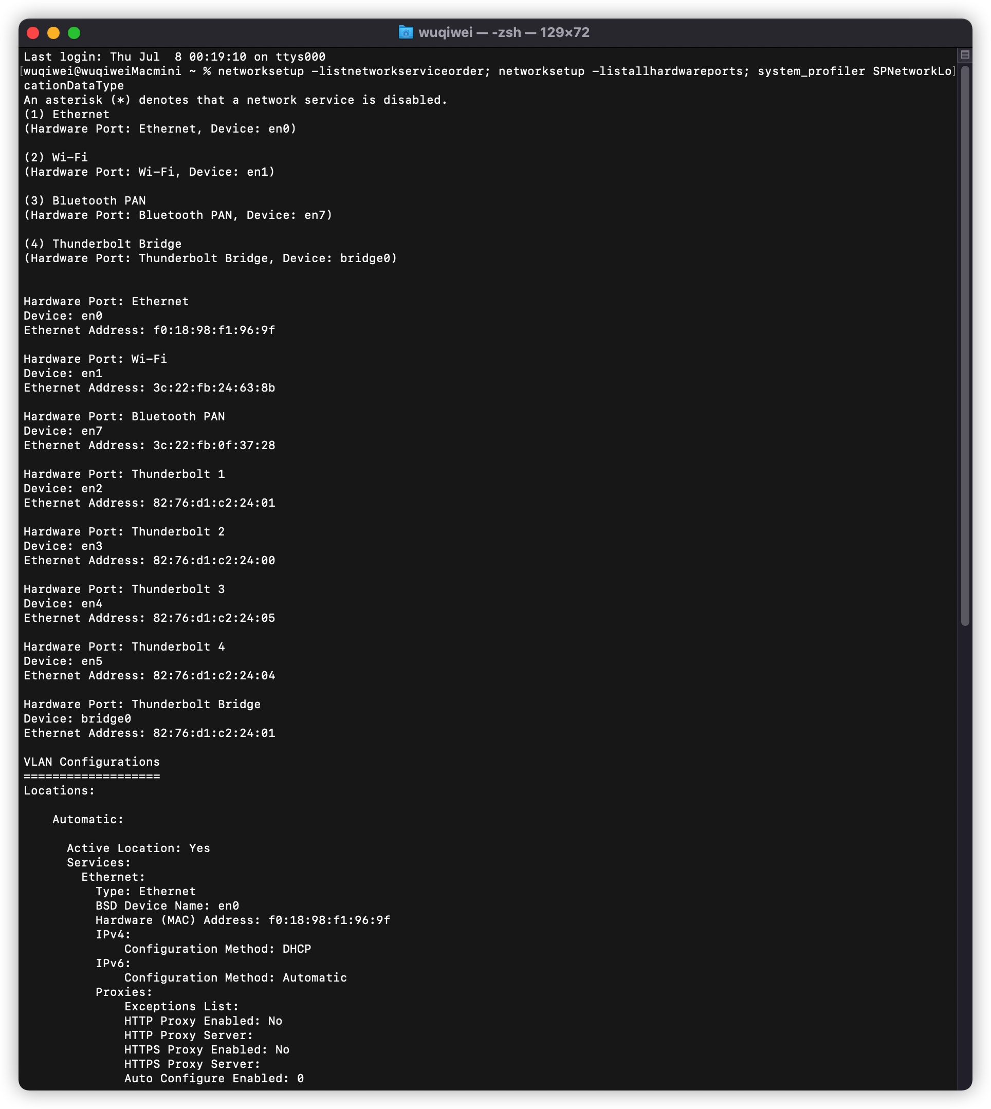 networksetup -listnetworkserviceorder; networksetup -listallhardwareports; system_profiler SPNetworkLocationDataType