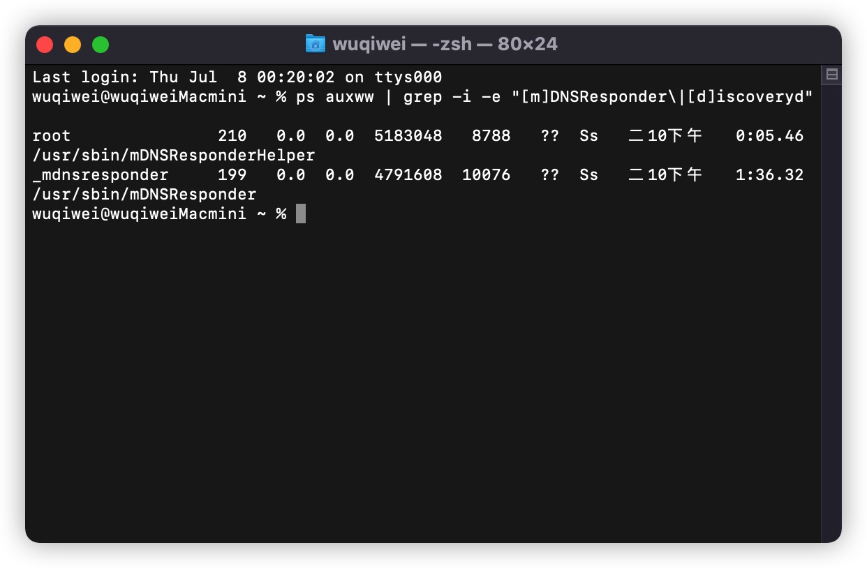 ps auxww | grep -i -e "[m]DNSResponder\|[d]iscoveryd"