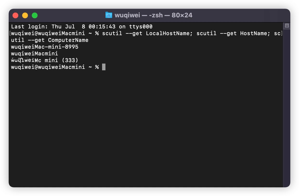 my="wuqiwei-MacMini"; sudo scutil --set ComputerName "$my"; sudo scutil --set LocalHostName "$my"; sudo scutil --set HostName "$my"