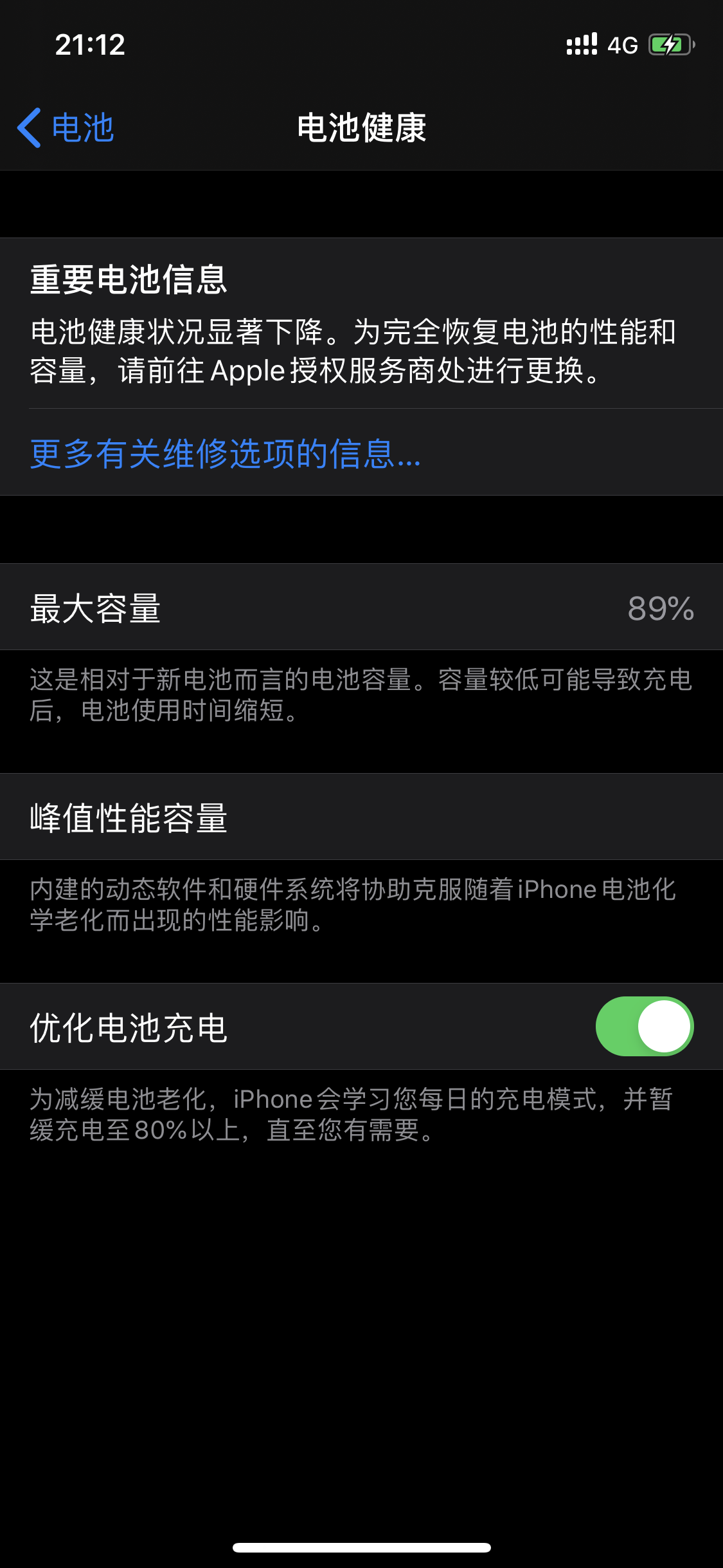 当电池健康报告系统正在重新校准时,您会在“设置”>“电池”>“电池健康”中看到一条信息。最大容量和峰值性能容量的重新校准会在正常充电周期内完成。这个过程可能需要几周时间。 在重新校准过程中,显示的最大容量百分比将保持不变。峰值性能容量可能会更新,但大多数用户可能不会注意到。 如果系统之前显示过关于电池健康状况有所下降的信息,那么在更新到 iOS 14.5 之后,这条信息将会移除。