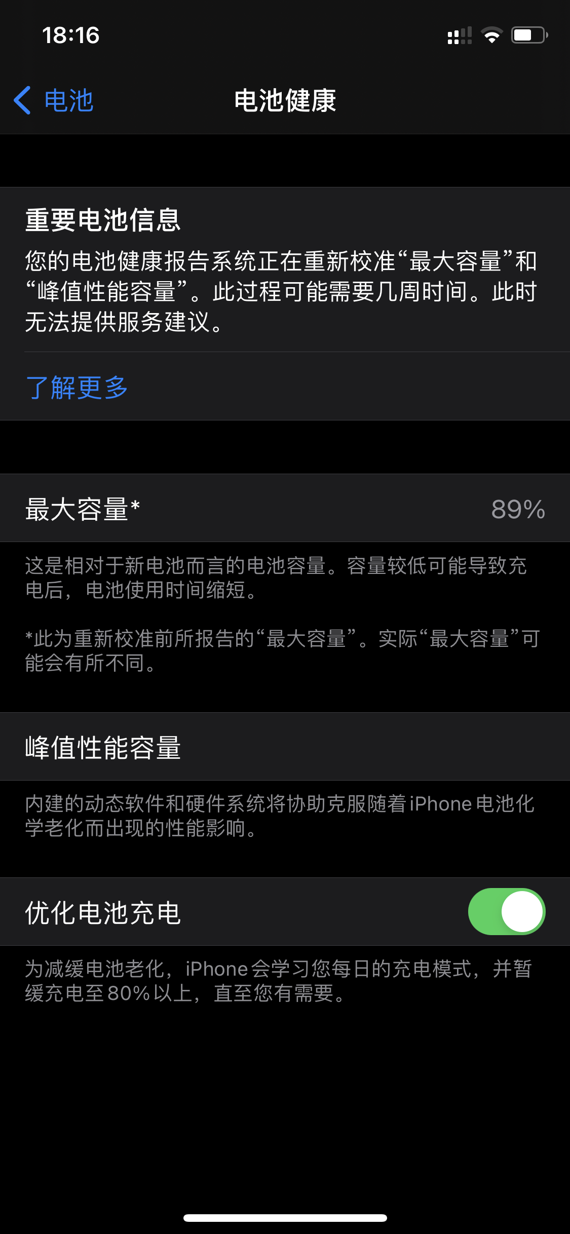 重新校准完成后,最大容量百分比和峰值性能容量将会更新。重新校准信息也将移除,表明这个过程已完成。