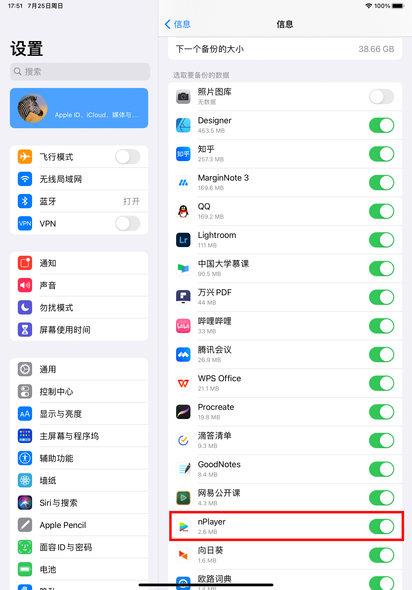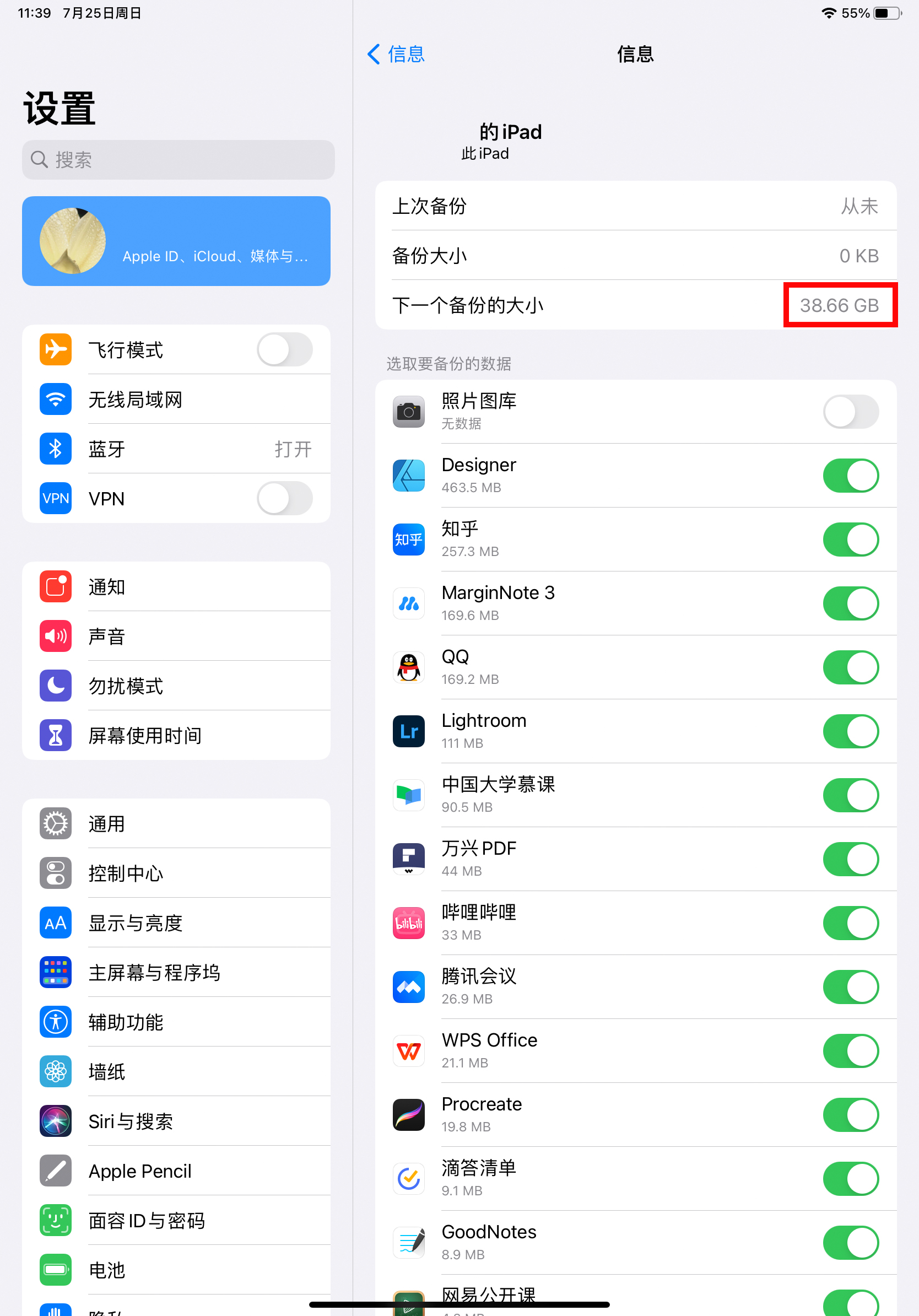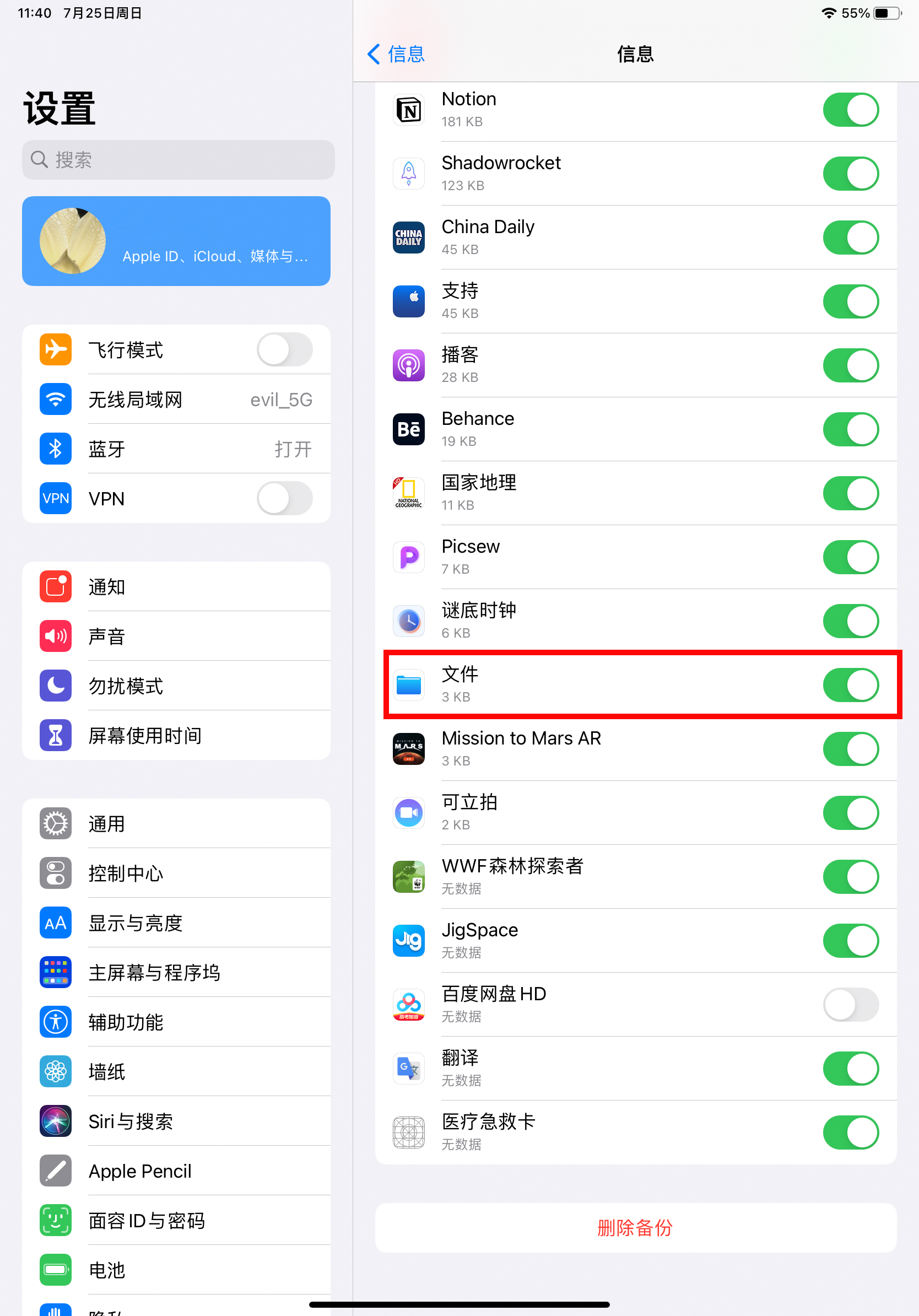 其他app的备份都可以开关,比如qq、procreate都有开关。虽然选项里有一个“文件"app的开关,但是只有3kb大小,打开与关闭并不影响整个备份的大小。
