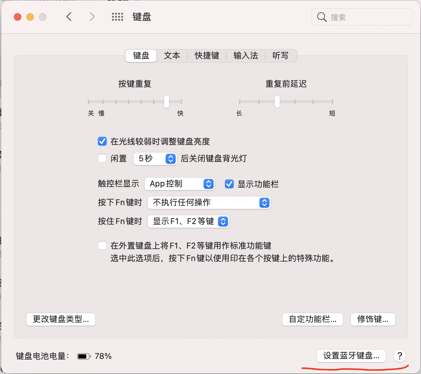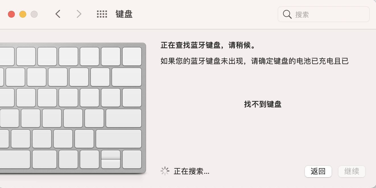 1.如标题所说:我使用的Magic Keyboard无线蓝牙键盘,能正常连接,也能正常使用,但是我有一天通过“系统偏好设置”-“键盘”- 键盘选项里面的“设置蓝牙键盘”,进入后,右下角界面一直显示正在搜索,中心显示找不到键盘,