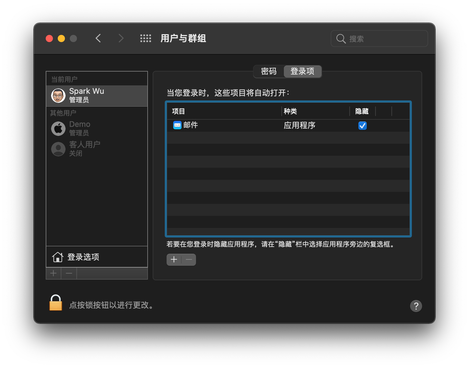 我自己是在启动项里面添加了“邮件”,并勾选了“隐藏”,这样“邮件”会在启动 Mac 时自动在后台运行。