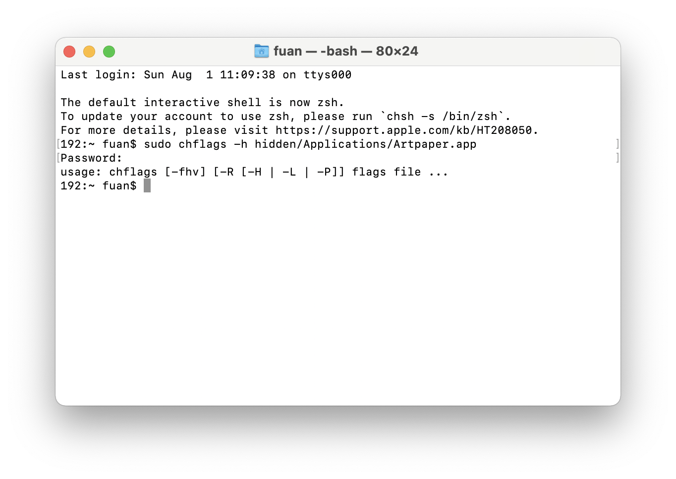 sudo chflags -h nohidden“/ Applications / [App Name] .app”