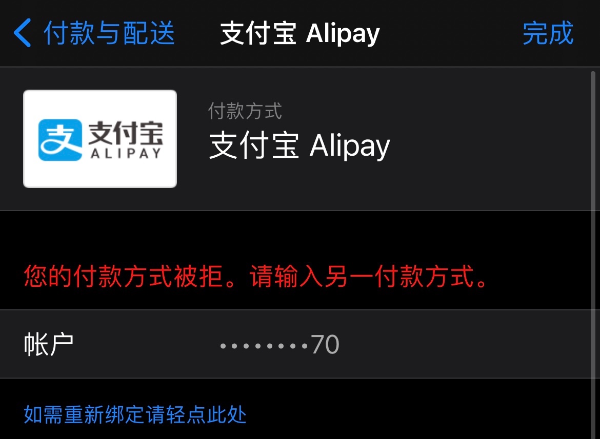 以下用户的用户个人资料: PeterLee0991 PeterLee0991 用户级别: 级别 6 17,099 积分 2021年8月3日 上午7:53 回应 梦铎 可能曾经有未完成的支付. 或者账单遗留问题.或者在Apple ID中绑定支付宝为支付方式的时候,验证未能成功.您可以联系Apple支持来帮助确认问题所在.Apple客服,电话:400-666-8800(社区是网友互助的常说,Apple不在这里提供直接的客户服务和技术支持. 这个问题可能需要客服帮您看看) 回复 链接