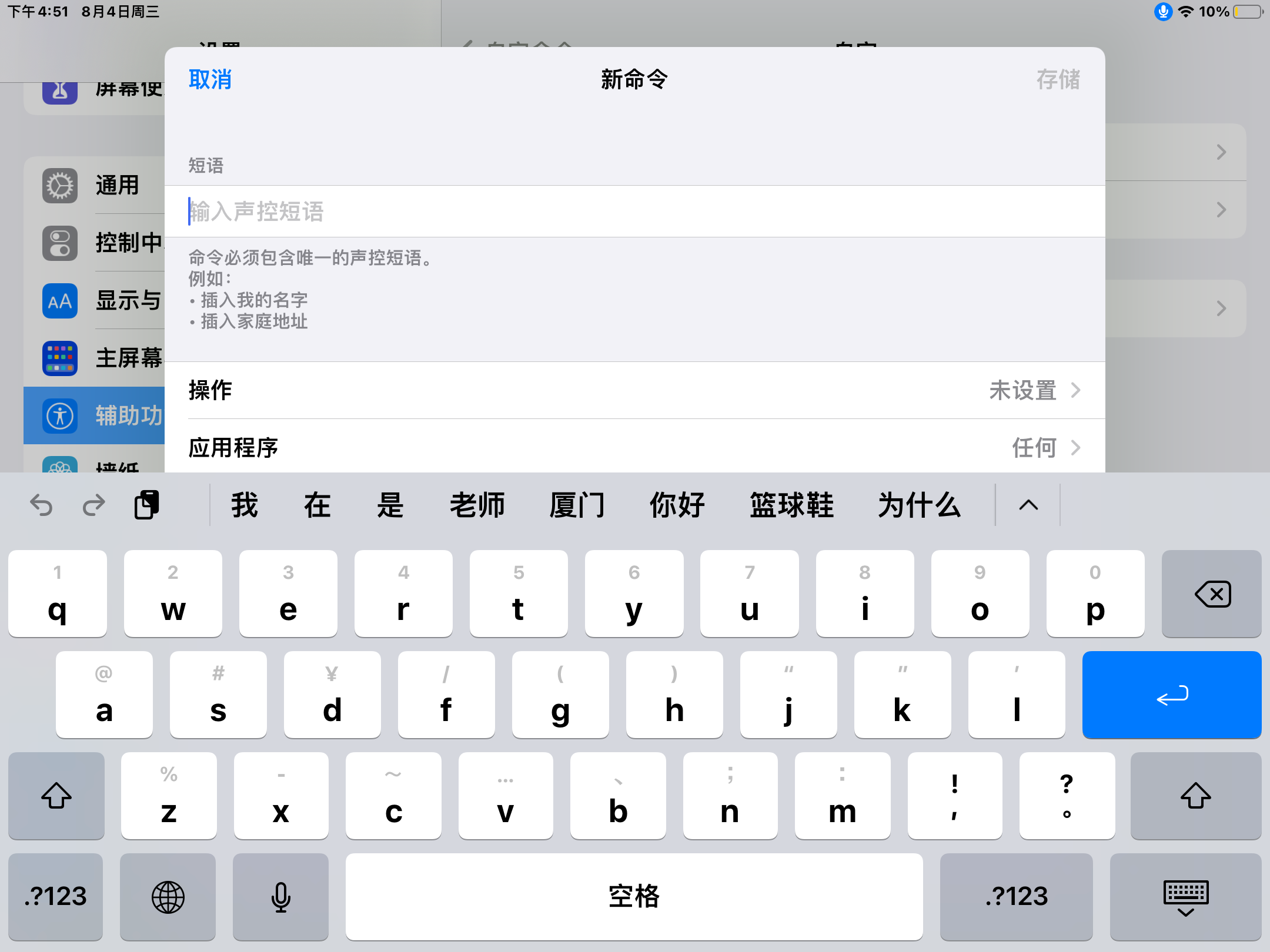 在设置中自定语音控制自定命令时无法输入自定的命令