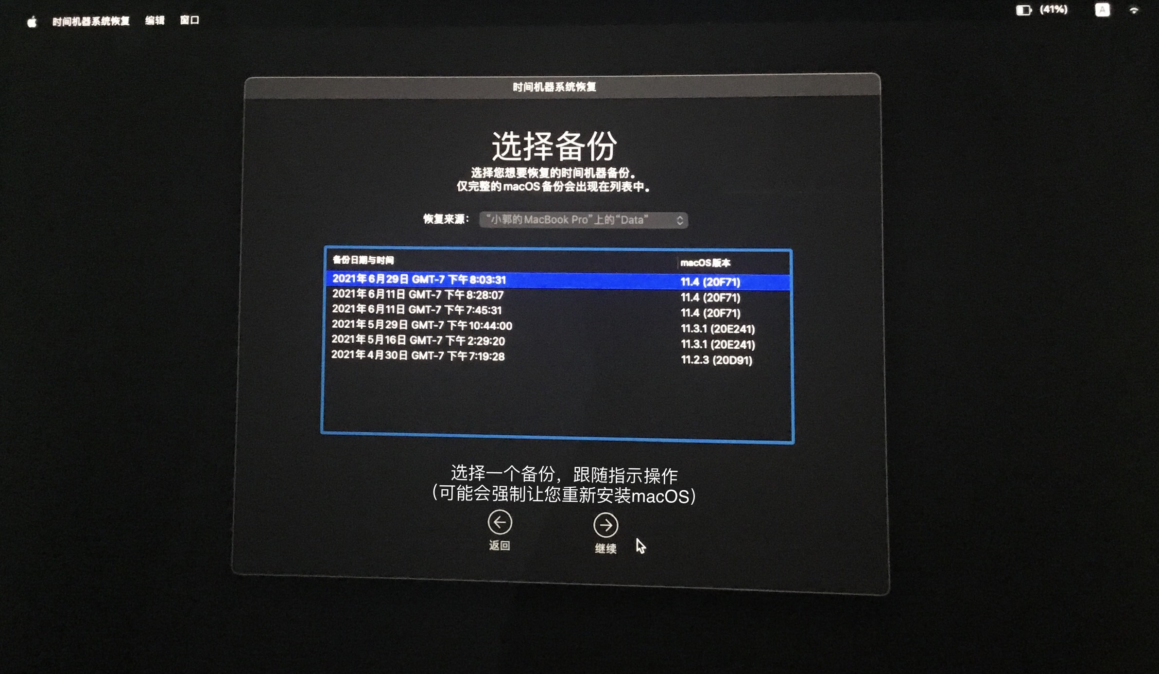 选择您的“时间机器”备份,然后点按“继续”。