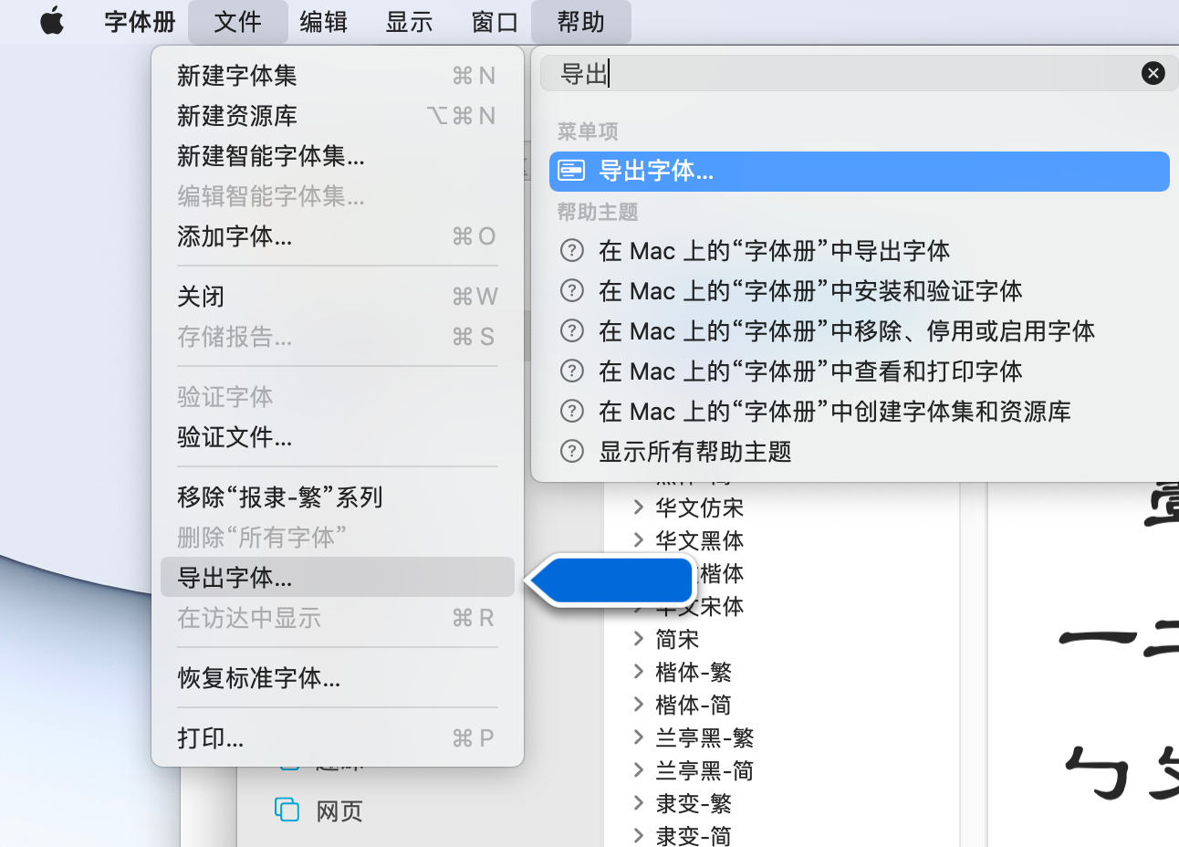 请在字体册(FontBook.app)中选中需要导出的字体,并且在菜单栏中选择“文件”>“导出...”。