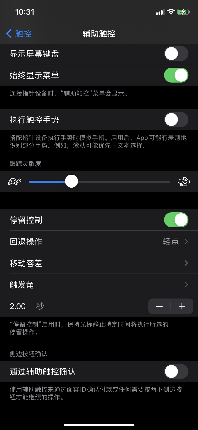 这个是通过辅助触控小白点来进行替代按两下侧边按钮的草足。如果想使用“通过辅助触控确认”,那么前提是打开了“辅助触控”(就是截图页面的最上面第一个开关)和“通过辅助触控确认”两个开关。