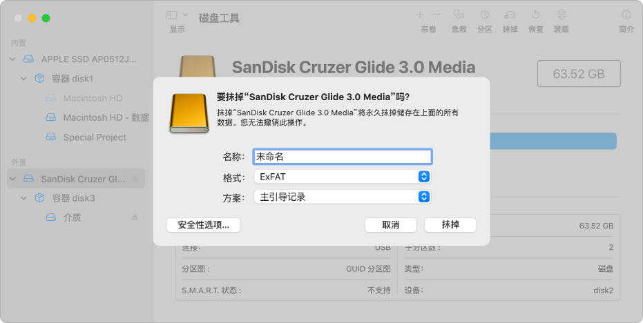 使用macOS预置的磁盘工具可以完成exFat格式化,在磁盘工具中选中该硬盘,选择“exFat”,选择“主引导记录”。
