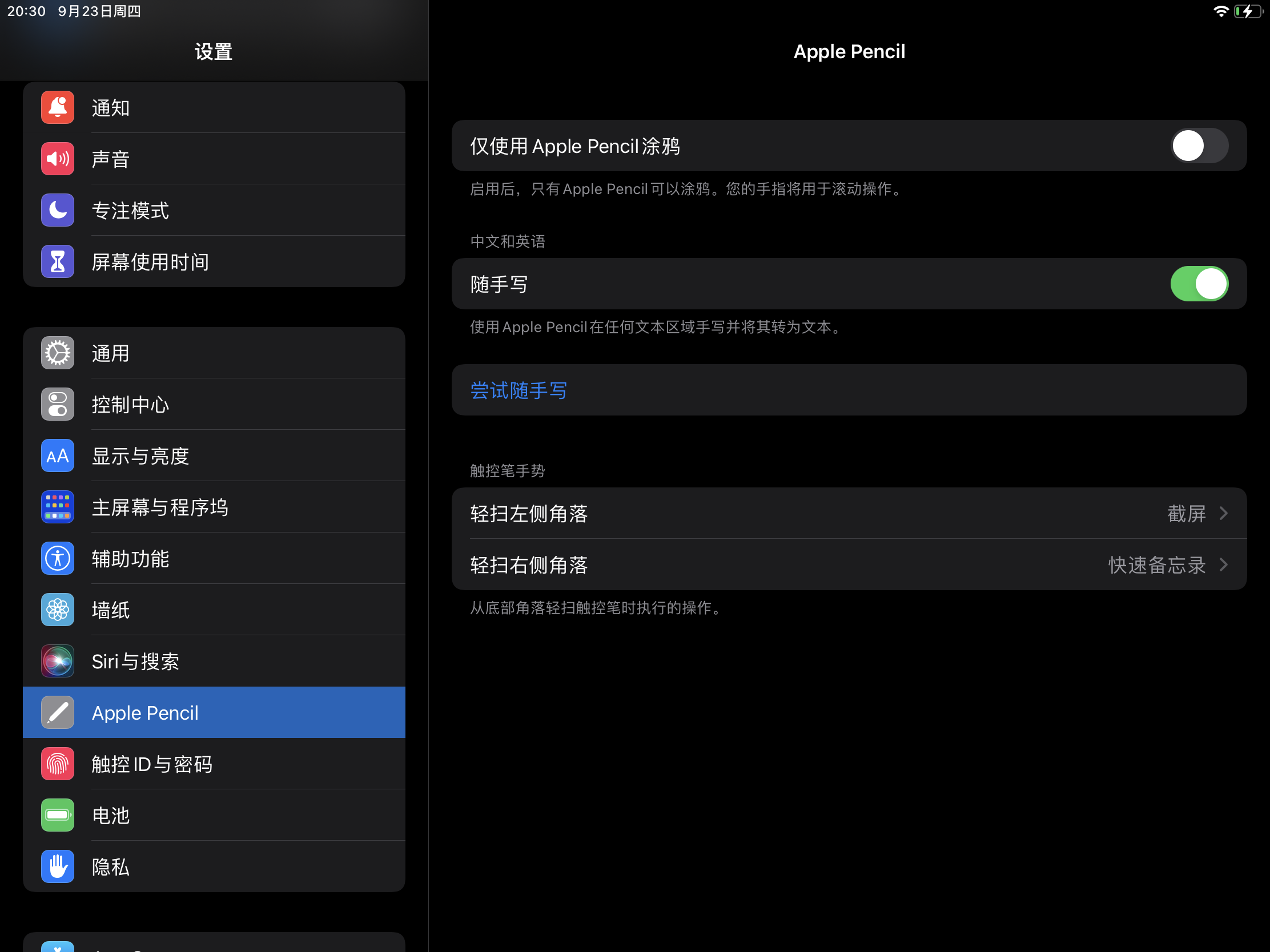 问题被标记为 排名最靠前的回复 以下用户的用户个人资料: SparkWu SparkWu 用户级别: 级别 7 28,336 积分 2021年9月23日 上午5:34 回应 月半子哥 “设置”>“Apple Pencil”>“轻扫右侧角落” 回复 链接