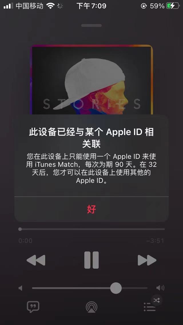 我的手机(他人赠送,已经还原过了,对方也已经登出AppleID,我也登陆了自己的AppleID)今天在听某些音乐(并不是所有音乐)时提示“此设备已关联到另一个 Apple ID。您在[数字]天内无法将此设备与其他 Apple ID 相关联。”而部分音乐听又没有此提示。