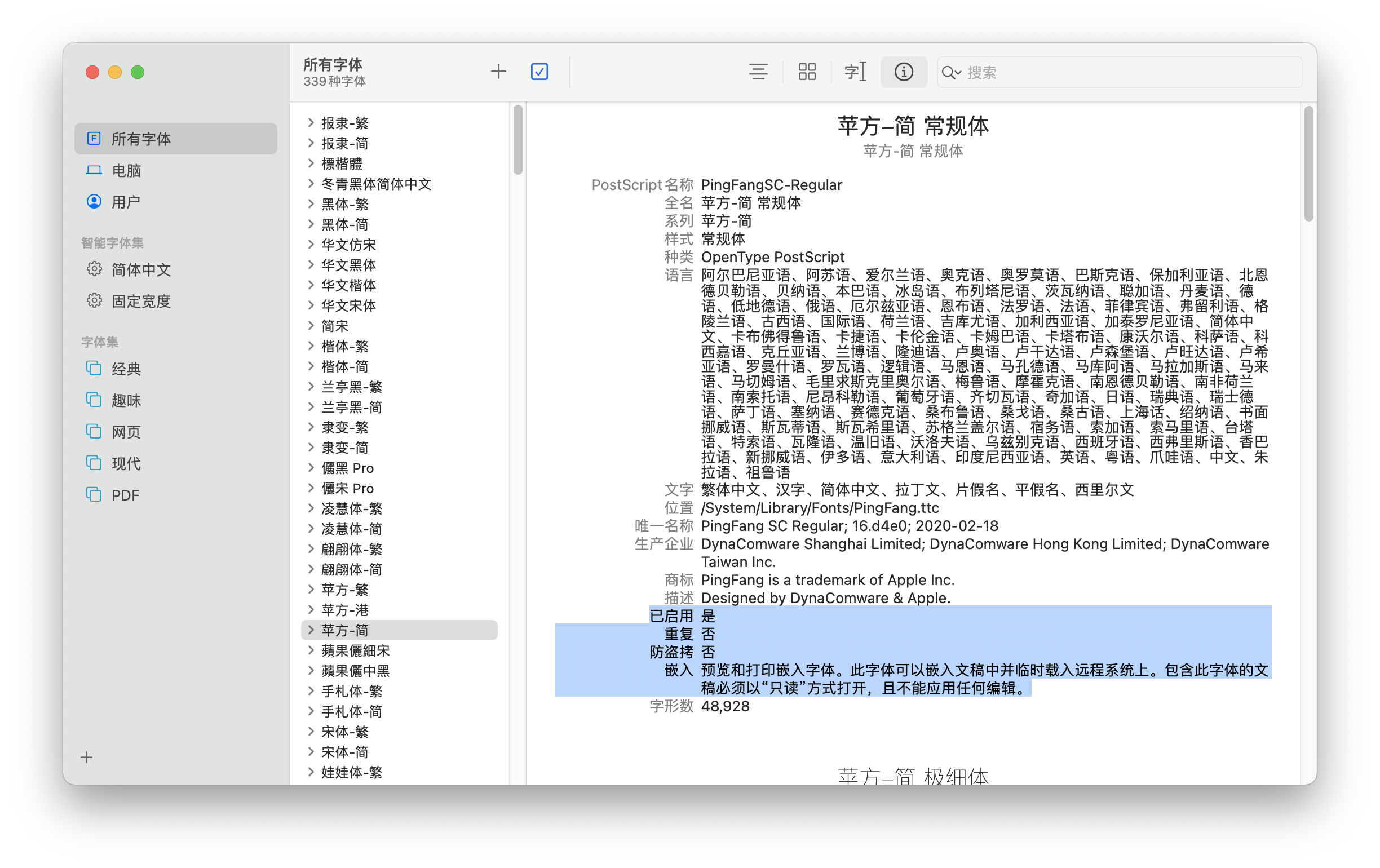 并且,你可以在“字体册”中找到有关字体的许可与嵌入信息。