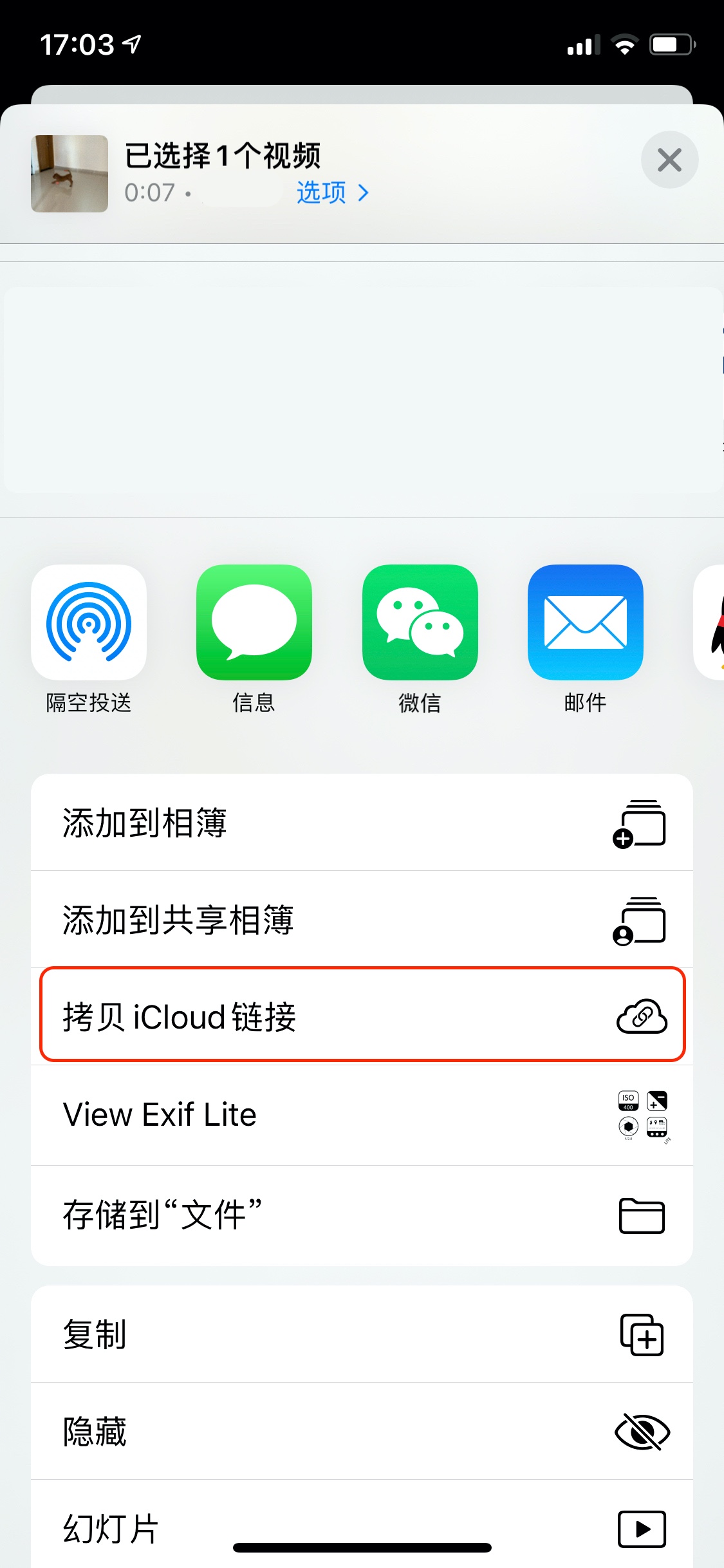 以下用户的用户个人资料: 亲爱的璞璞 亲爱的璞璞 用户级别: 级别 6 11,557 积分 2021年8月21日 上午2:09 回应 平平无奇的美少女 微信 App 在发送时默认会压缩原画质便于发送,对方收到的视频和原片相比差了不少,大部分第三方社交 App 都有这个现象。有个很好的办法可以将原片发送出去,打开视频后点击左下角分享按钮,选择“拷贝 iCloud 链接”将该视频生成一个链接,把链接发给对方让其下载即可。 回复 链接