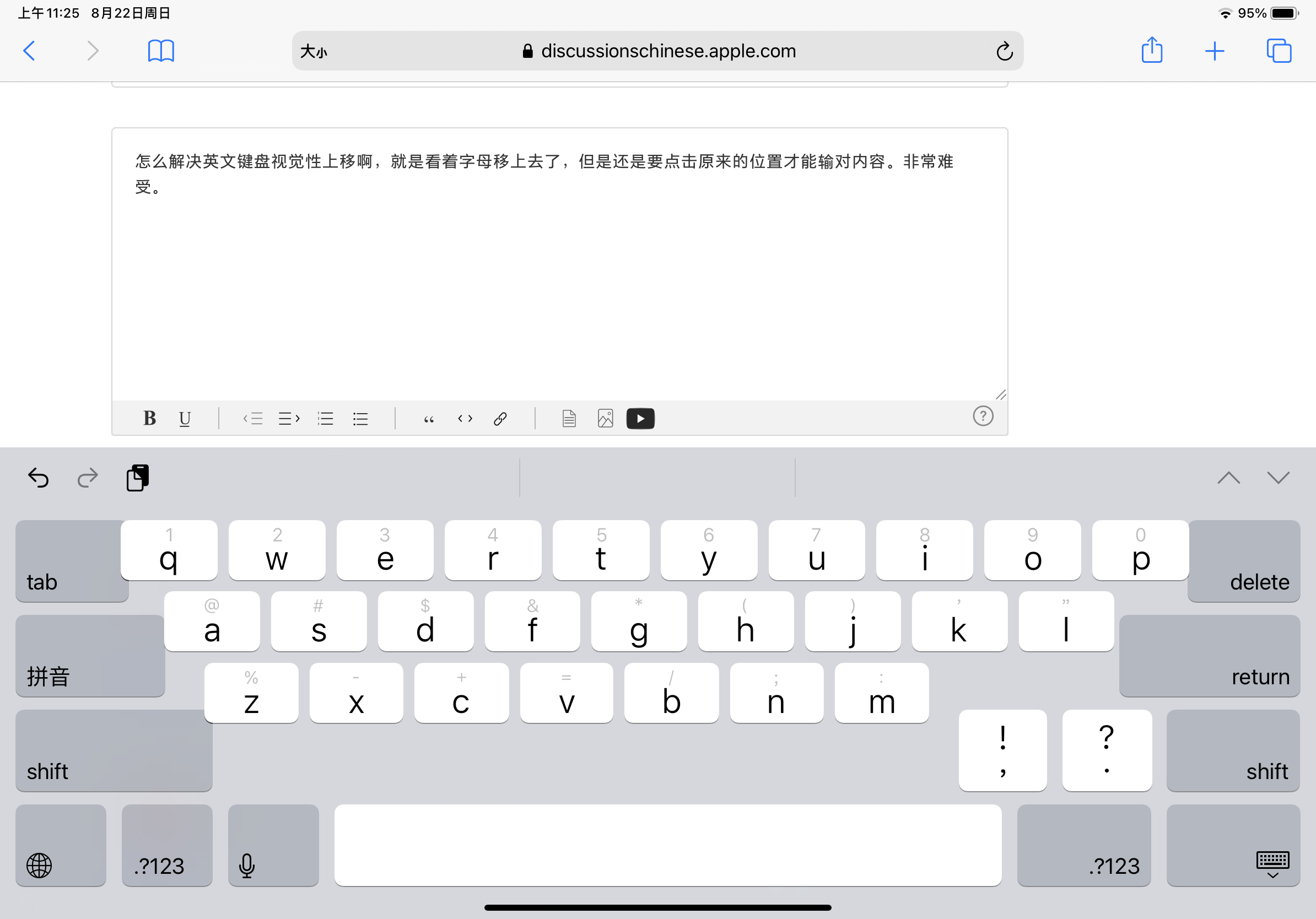 问题被标记为 排名最靠前的回复 以下用户的用户个人资料: 芝华塔尼奥 芝华塔尼奥 Community+ 2025 用户级别: 级别 10 82,000 积分 2021年8月23日 上午3:05 回应 Izuer 关机重启一次。或者 按住最右下角那个键盘图标不放 出现浮动键盘按一下。浮动键盘出现在返回。看看是否改善 回复 链接