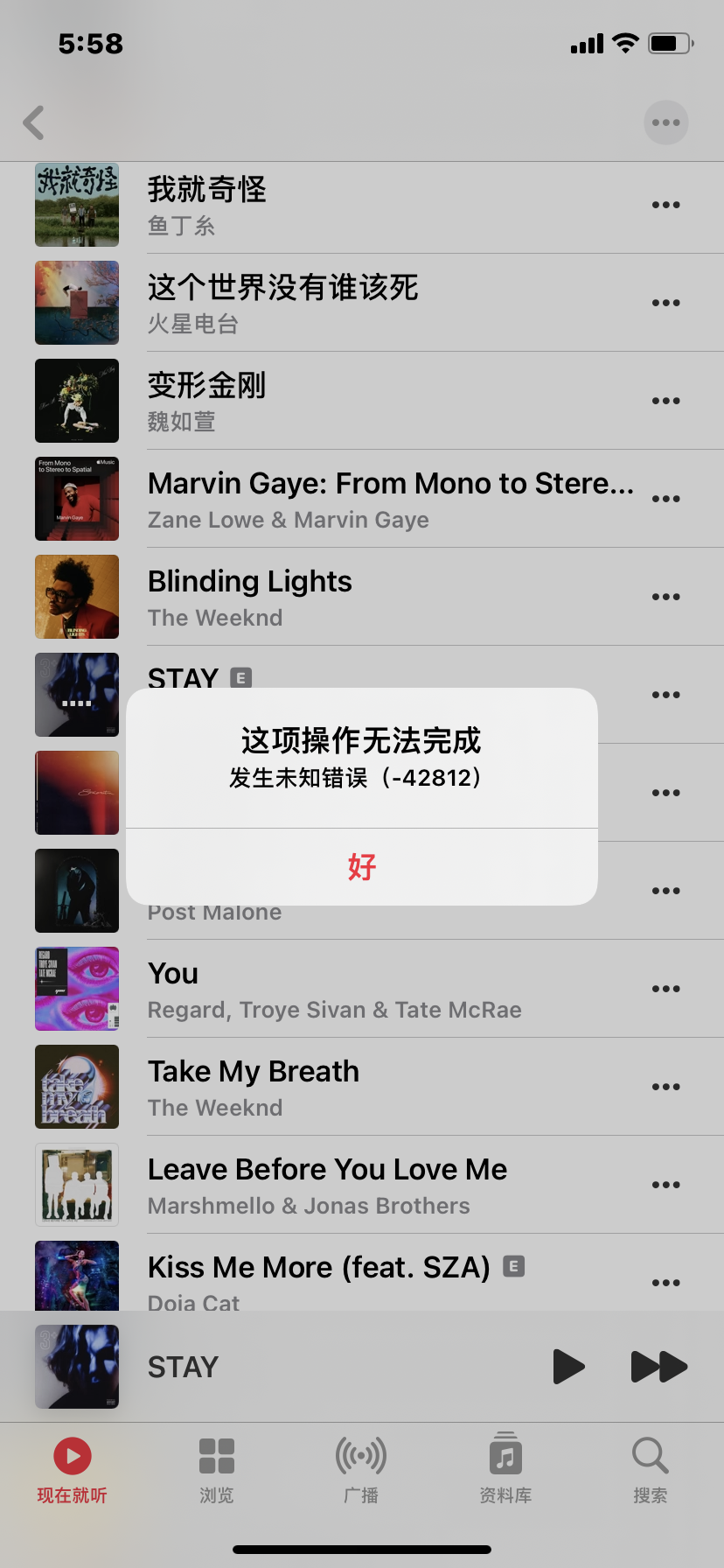 大家好啊,我的Apple Music 正在试用期,每次播放音乐都会有 这项操作无法完成 的提示发生错误-42812导致我无法听音乐,烦人……