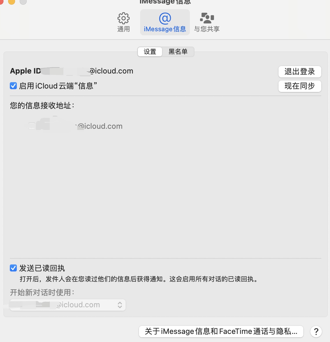 已经在appleID中绑定了三个手机号,但是imessage配置中的“开始新对话时使用的账户”是icloud账户且无法更改为手机号(配置项直接是灰色的),导致我发给朋友的消息都被拦截了