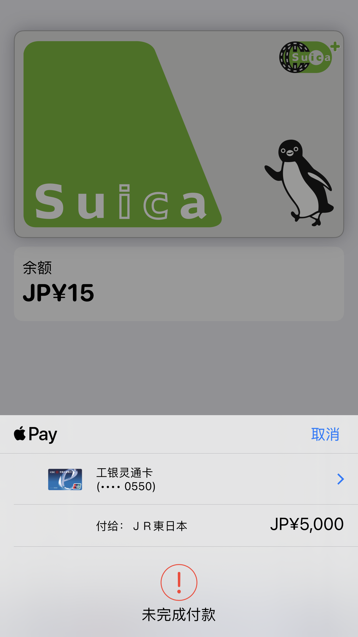 8月22日开始,使用绑定的银联卡进行充值显示「未完成付款」(最后一次使用银联卡正常充值是8月10日),到目前仍然不能进行充值。所使用的银联卡为借记卡,之前一直使用此卡片能够正常进行充值,余额充足,充值国内公交卡正常。为排除手机问题,我已尝试将设置重置、账户重新登陆、删除钱包所有卡片重新绑定等,都未解决问题。