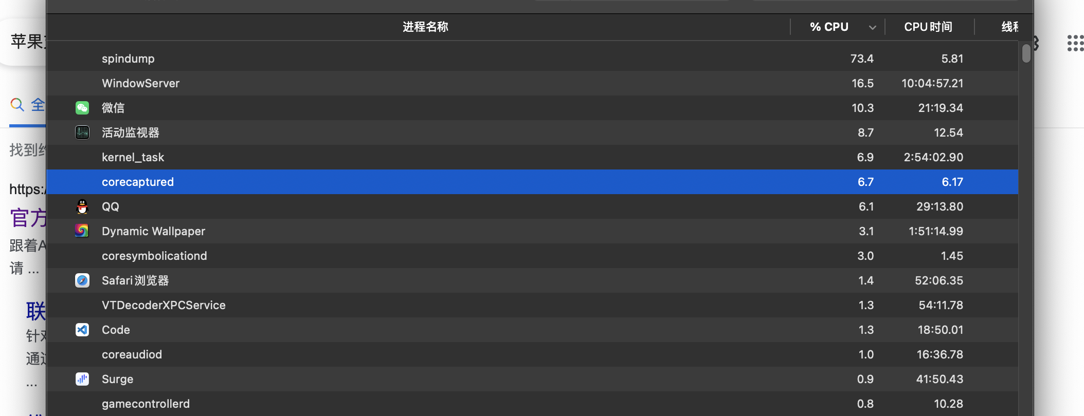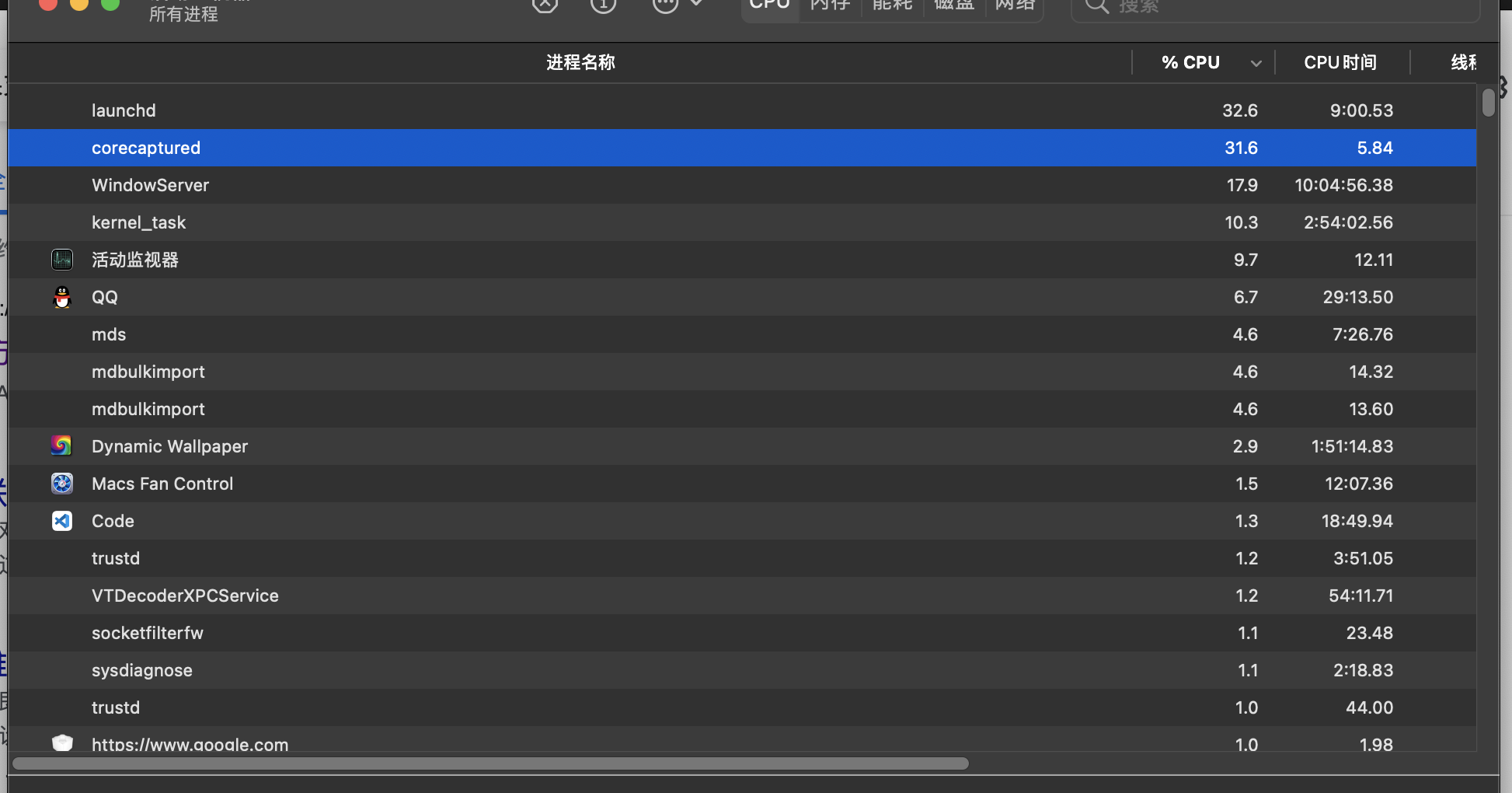 设备是Macbook pro 13 2020 英特尔版本,系统为Big Sur11.4,不知什么时候开始,Mac总会在某些情况下突然风扇狂转,cpu温度狂飙100度,然后过了不到一分钟会降回去,但风扇还要转好久,然后自动弹出tmp文件夹。以前遇到这种情况没有太在意,然而今天下午一共出现了三次这种情况,并且之前出问题的时候打开资源监视器没有发现什么异常,在今天晚上最后一次出现问题的时候截了几张图,有几个程序占用更高,但几秒钟就会掉下来,比如蓝色选中的,只是几秒钟高占用就跌回正常