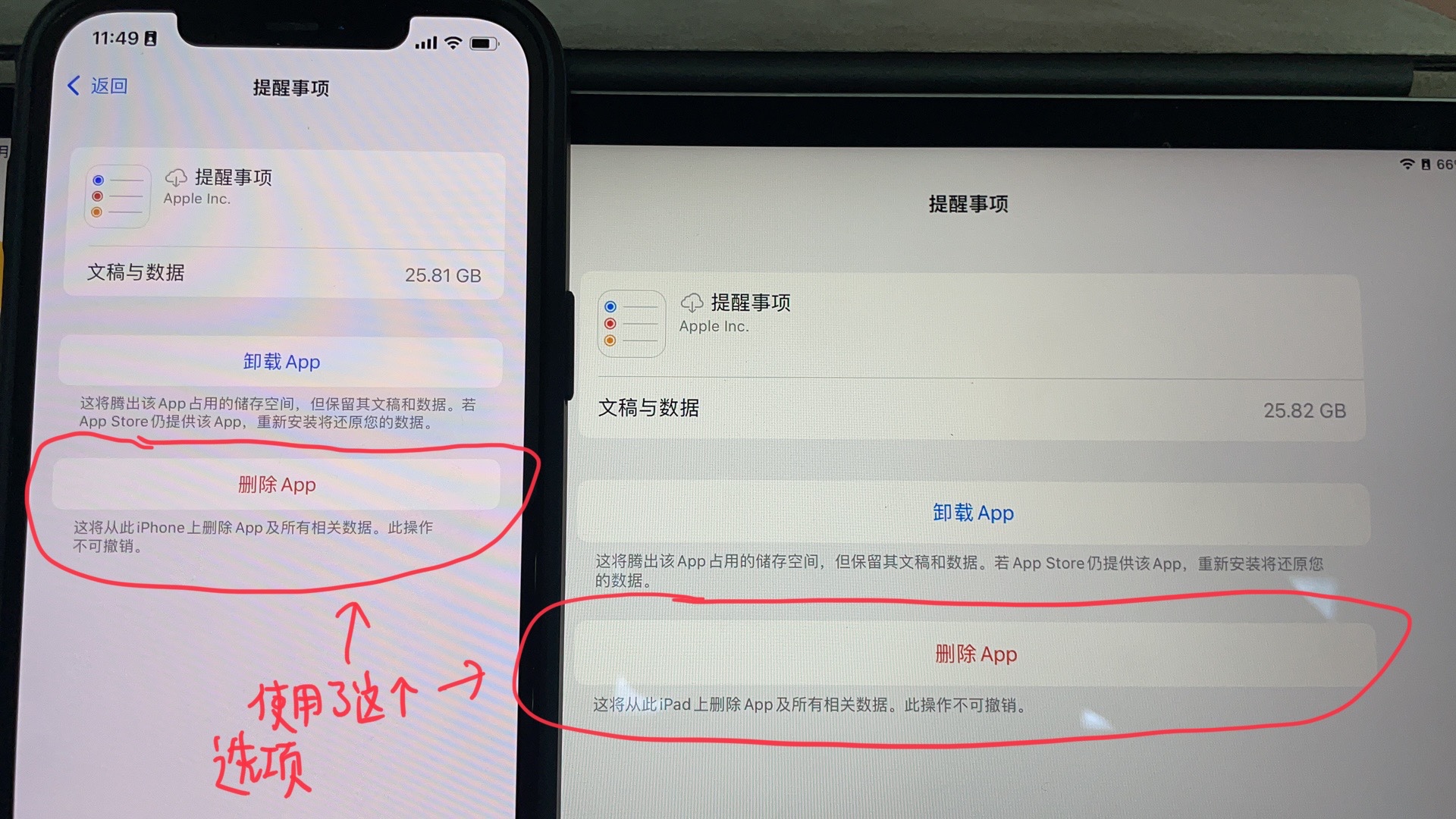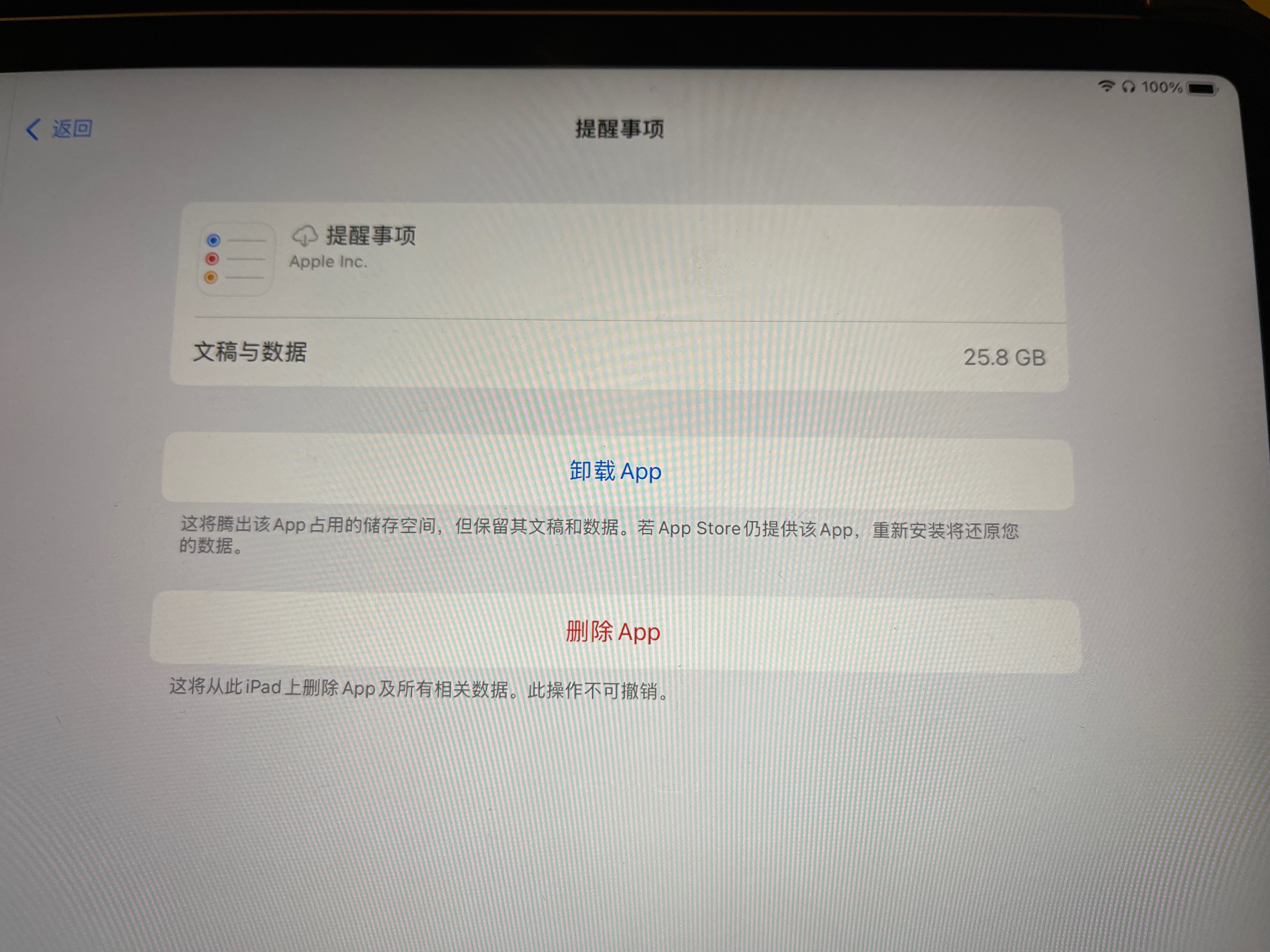 选择删除app之后,在iPhone储存空间里查看依然留存,再次删除也只是回到储存空间的页面,空间占据没有变化。尝试删除提醒事项app后抹掉并还原iPhone,恢复完备份,仍然显示提醒事项的数据与文稿占据着25.84G的空间。
