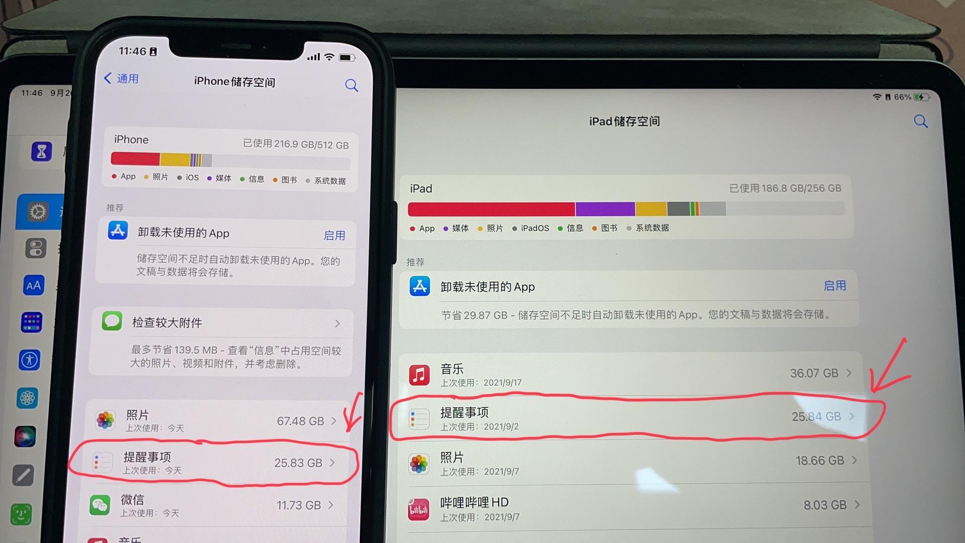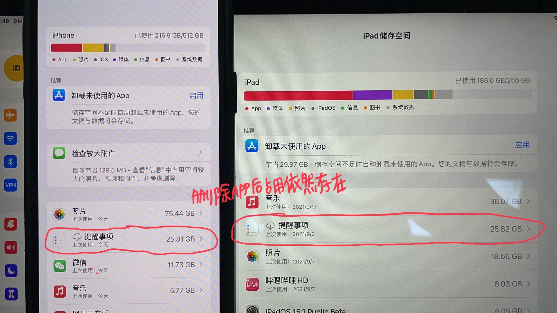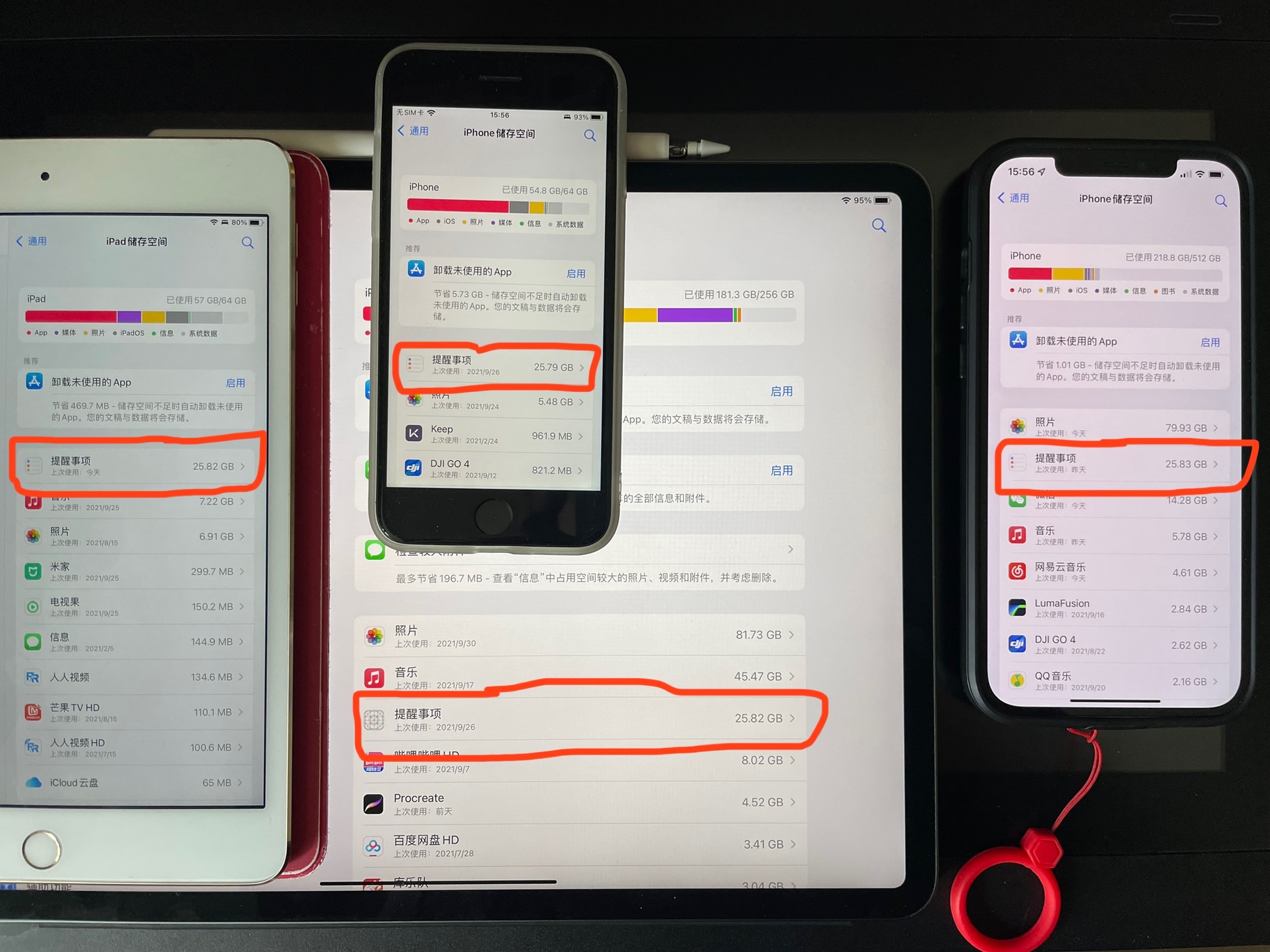 补充:升级iOS15正式版后依旧无法彻底删除提醒事项的文稿和数据,且除了iPhone,在查看iPad Pro储存空间时也发现提醒事项也有25.84G占用