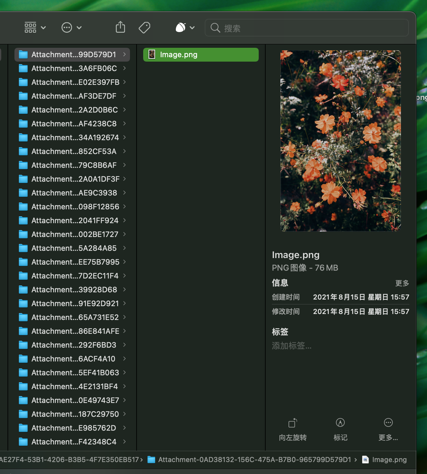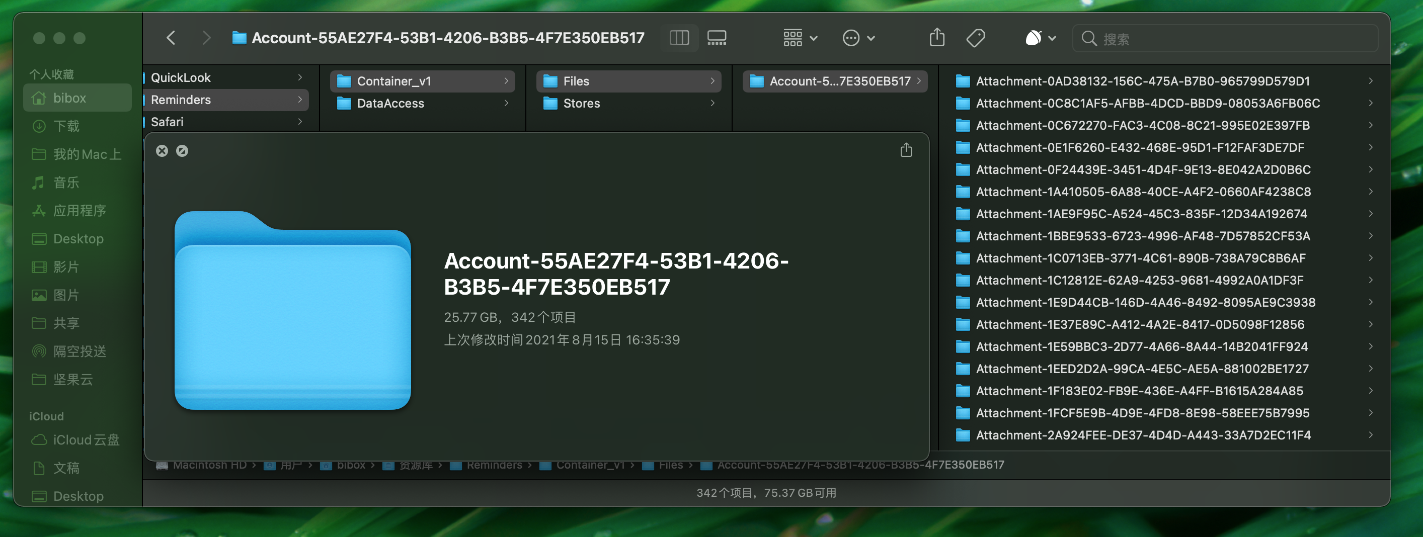 在macbook上也发现了提醒事项的相关文件,于是终于发现了空间占用的元凶,是几百个不同名字的文件夹,每个文件夹里都是同一张图片。