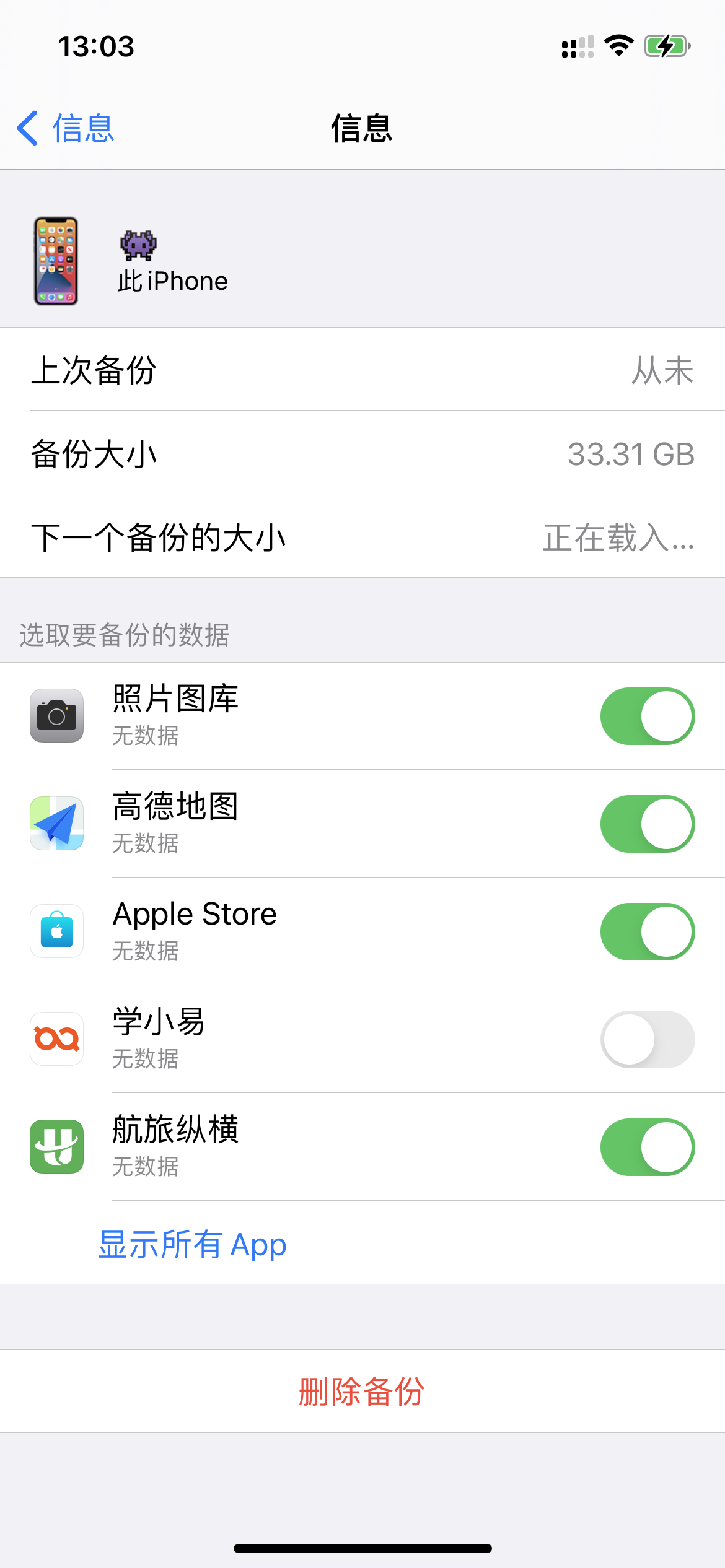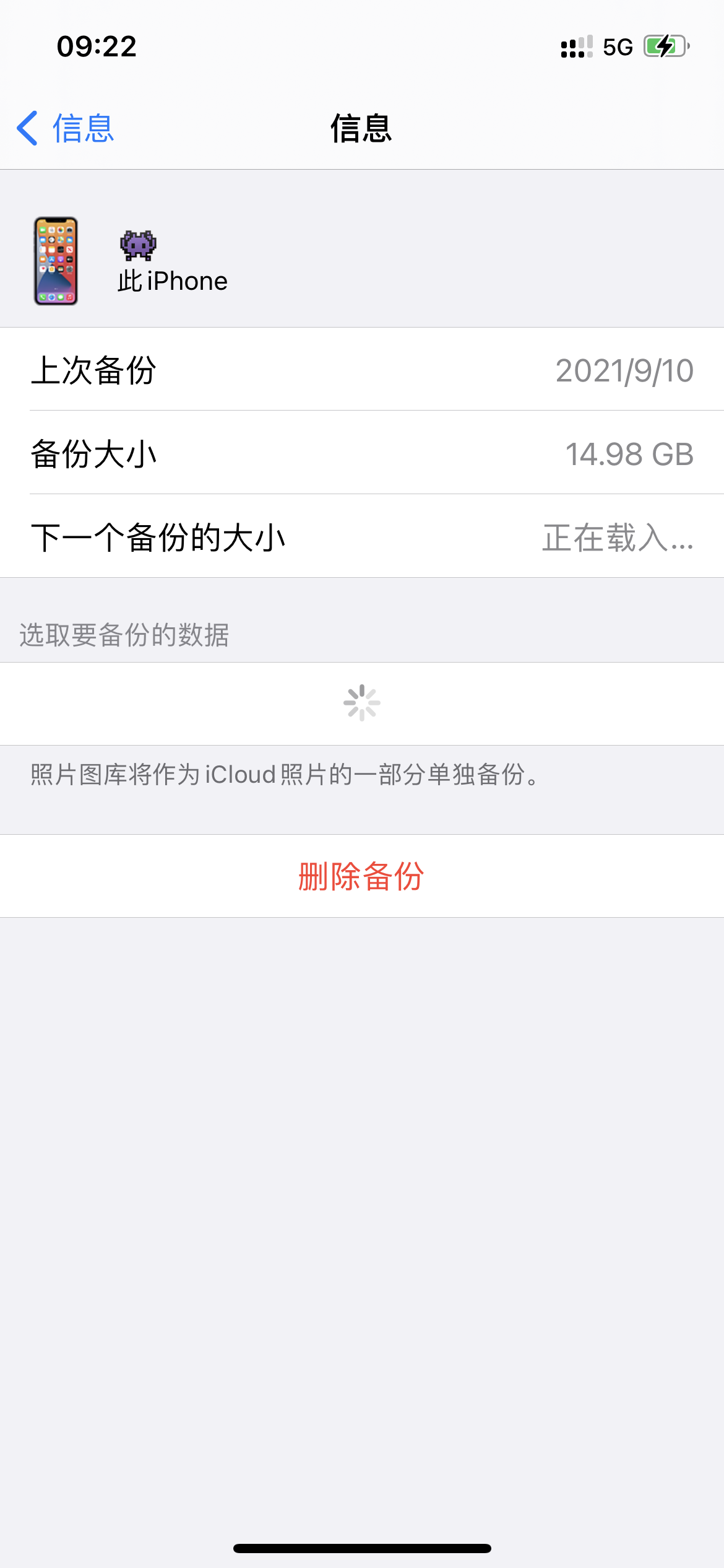 现在正在进行的备份,占用的空间中“照片图库”与“iCloud照片”重复(由于此前删除了备份,此处未显示大小);