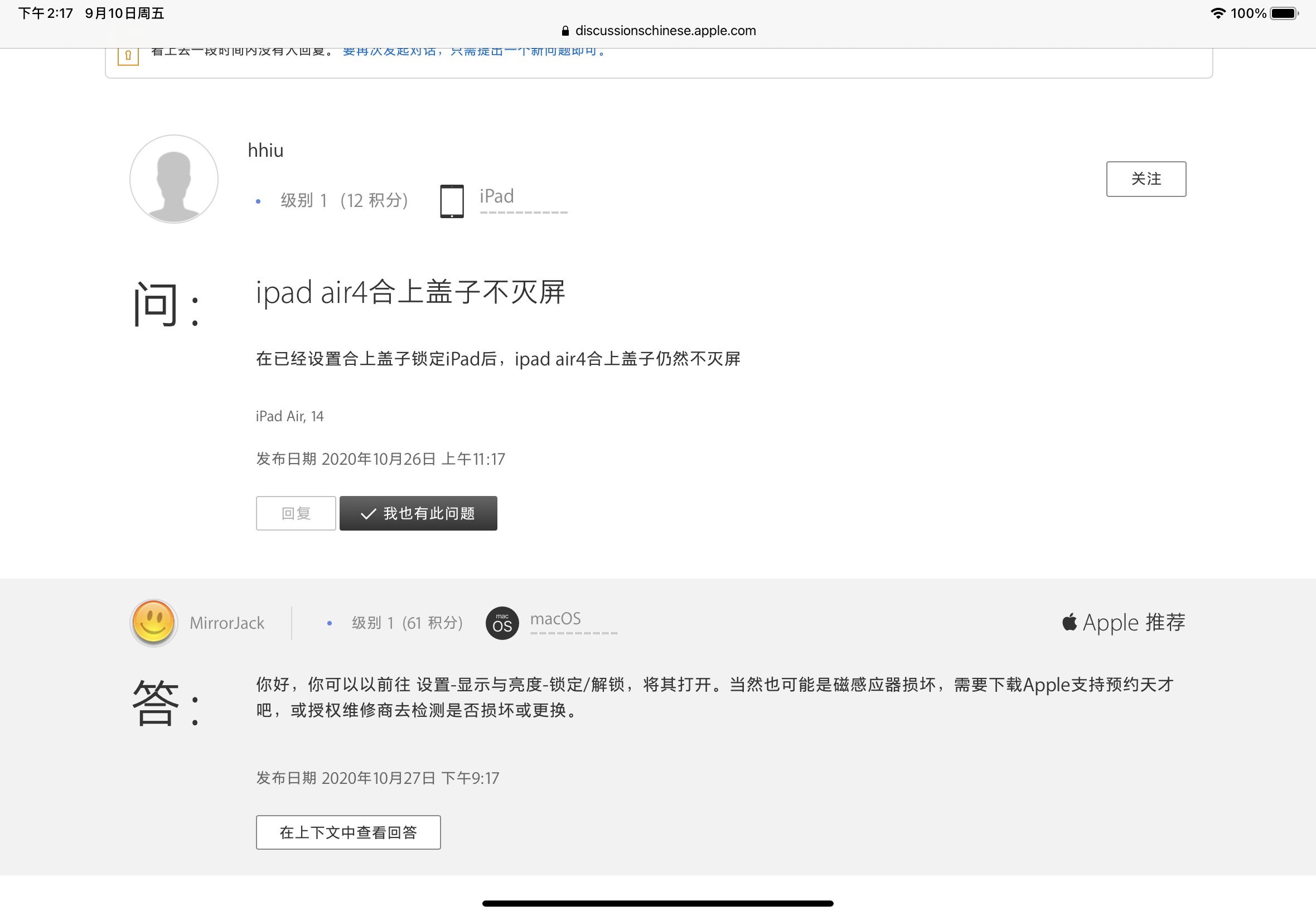 以下用户的用户个人资料: CadeC CadeC 用户级别: 级别 5 4,631 积分 2021年9月10日 上午1:59 回应 要相信光 如果有更换过确认功能正常的保护套还是这样,还是建议优先通过软件方面的问题尝试解决,建议你对设备的设置做个还原:设置-通用-还原-还原所有设置,会对还原ipad的设置,然后重新设置相关功能,还不行客户考虑恢复出厂设置重新激活一下,再又问题,备份预约售后吧 回复 链接