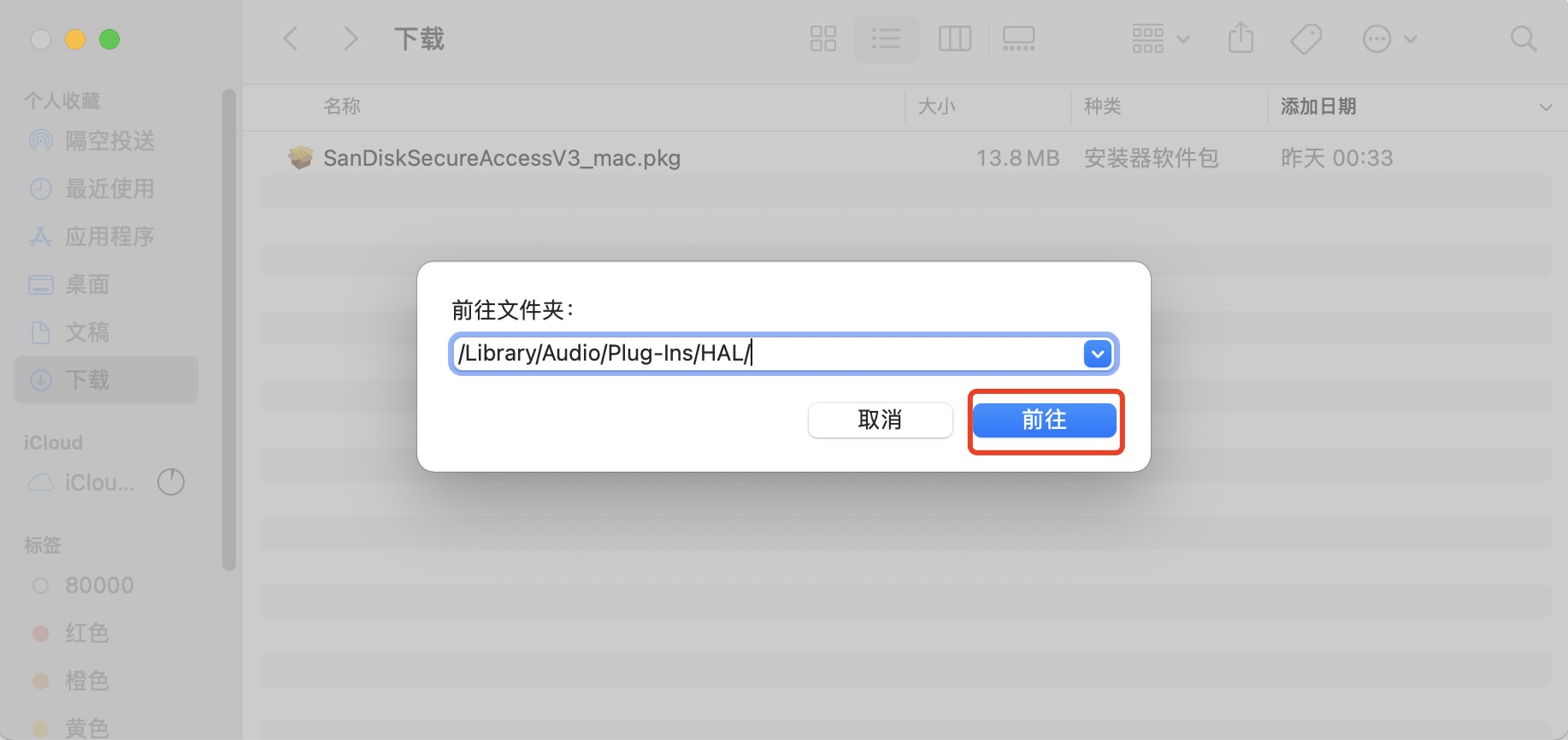 第三步输入/Library/Audio/Plug-Ins/HAL/点击前往