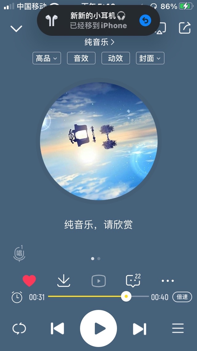 当有一只AirPods离开您的耳朵时, 两只AirPods的播放会同时停止;