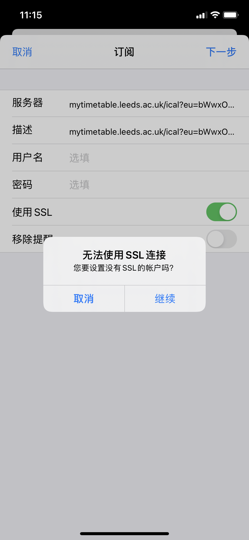这个订阅是有 SSL 的吗?如果没有,取消勾选 SSL,点“继续”就好了。