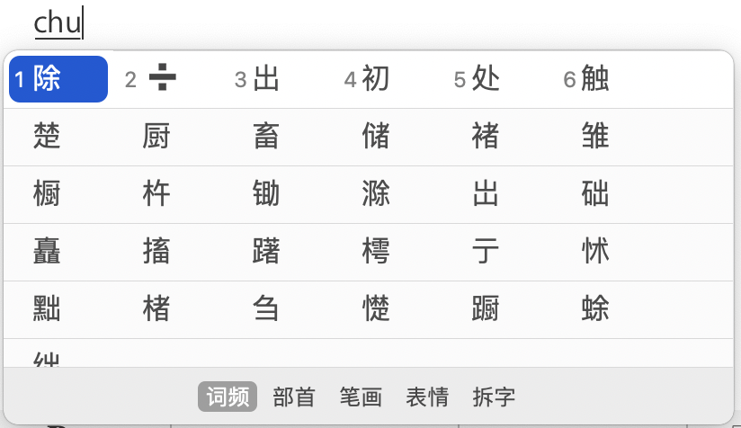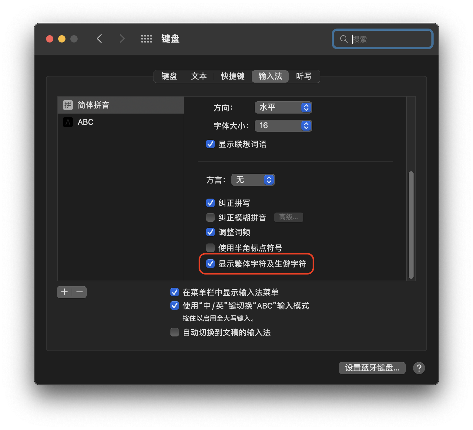 到“系统偏好设置”>“键盘”>“输入法”>“简体拼音”里面打开“显示繁体字符及生僻字符”就好。