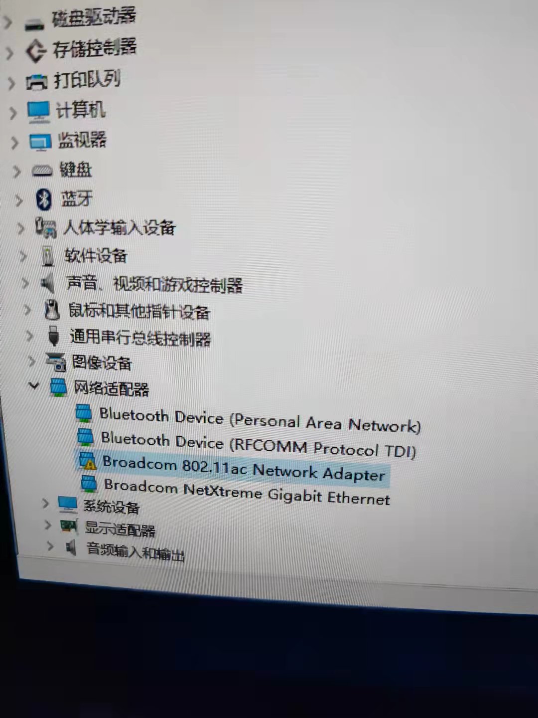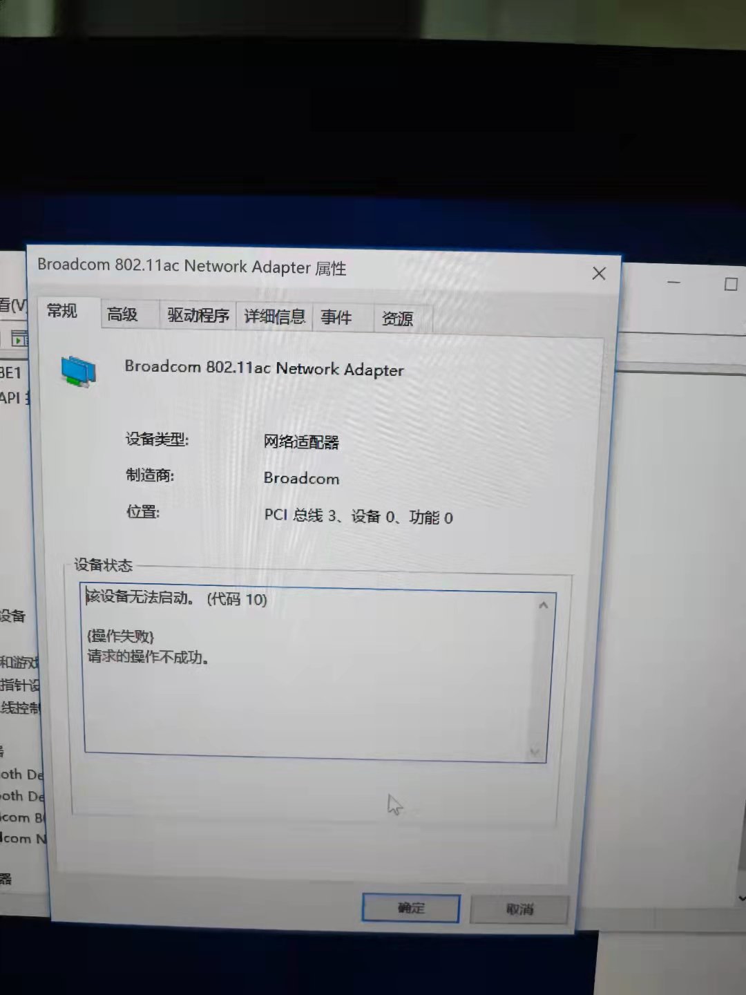 1,到设备管理器查看为broadcom 802.11ac适配器,显示感叹号,属性显示无法启动 代码10