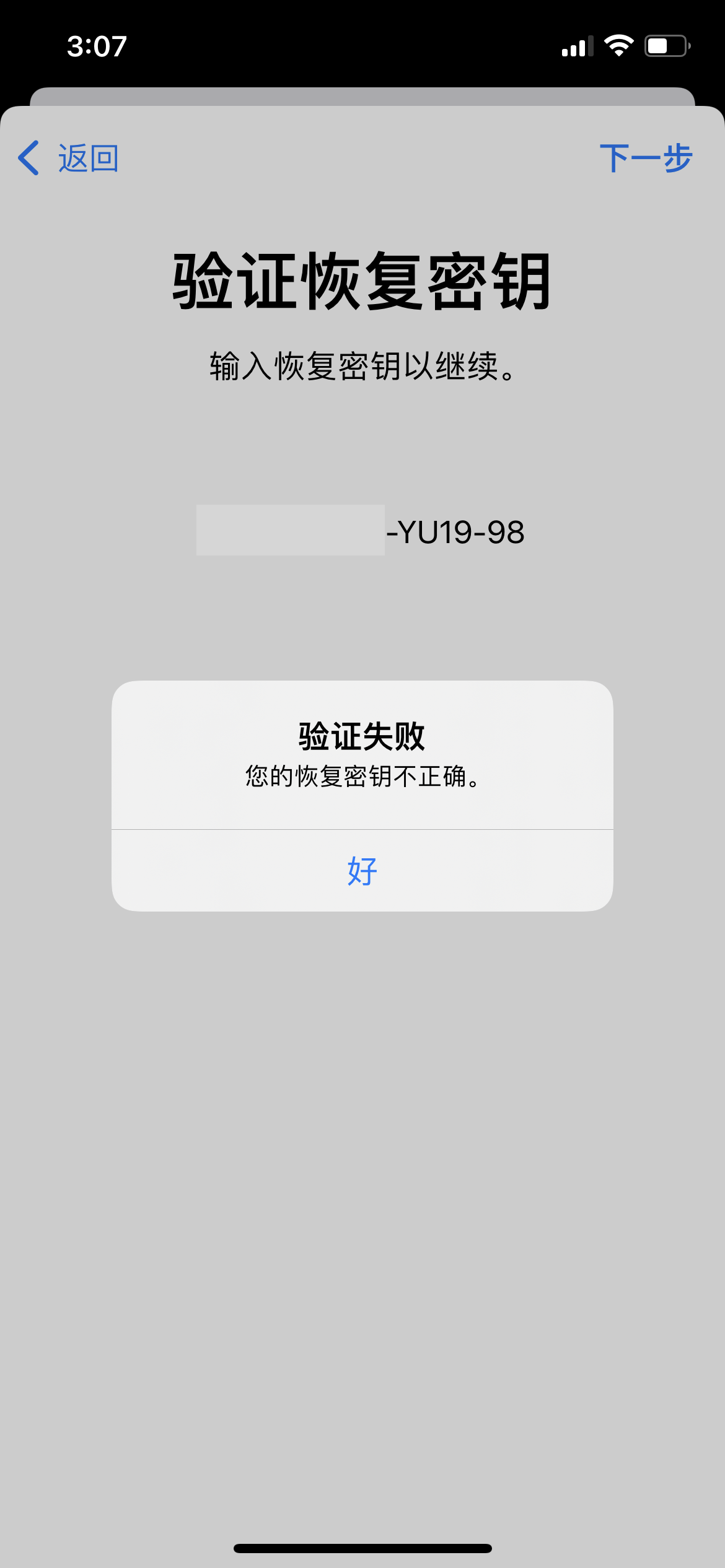 你这是之前开启过恢复秘钥。但你是忘记密码还是无法更改密码使用恢复秘钥来登录呢