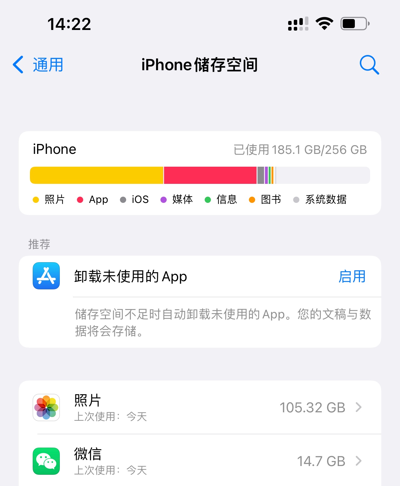 原本用的iPhone12pro,在购买iPhone13pro max之前看了一下储存空间仅256G的一半,所以毫不犹豫的够买了256G的iPhone 13 pro max。但是待数据迁移完成,并日常使用一阵子之后,偶然打开自己的储存空间发现照片所占容量暴增,可用容量已经没多少了,所以目前删了几款大型游戏之后的状态稍有改善:185.1/256GB。对比我Mac上的照片所占容量来看,似乎iPhone上的照片体积是Mac上的好几倍(iPhone显示照片有105G,Mac显示照片只有20G),这是什么原因呢?
